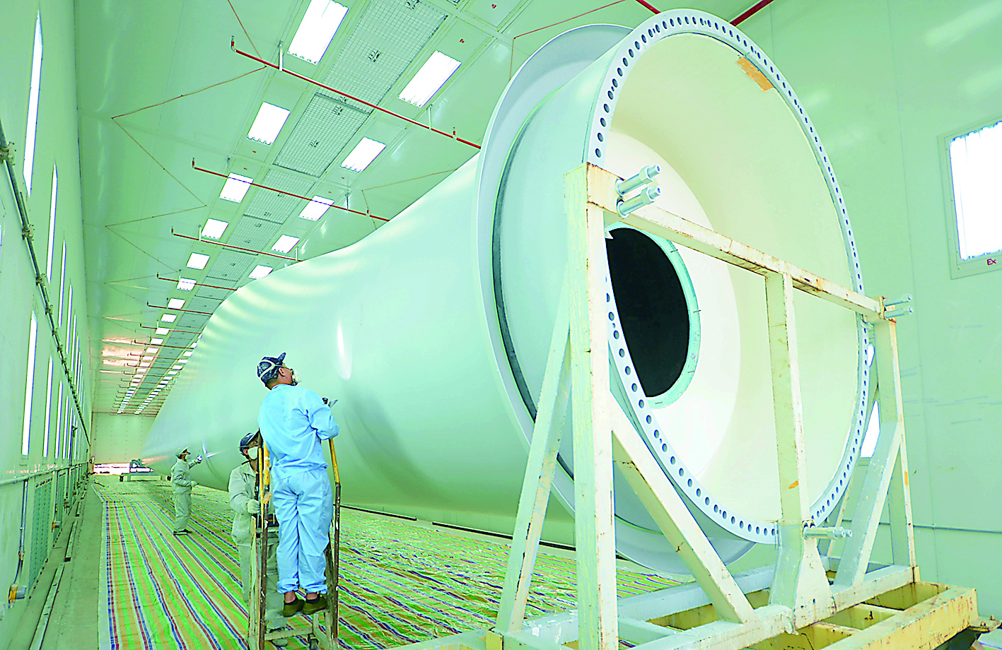 后处理车间的工人在油漆后检查叶片质量。一点小小的瑕疵也逃不过他们的火眼金睛。