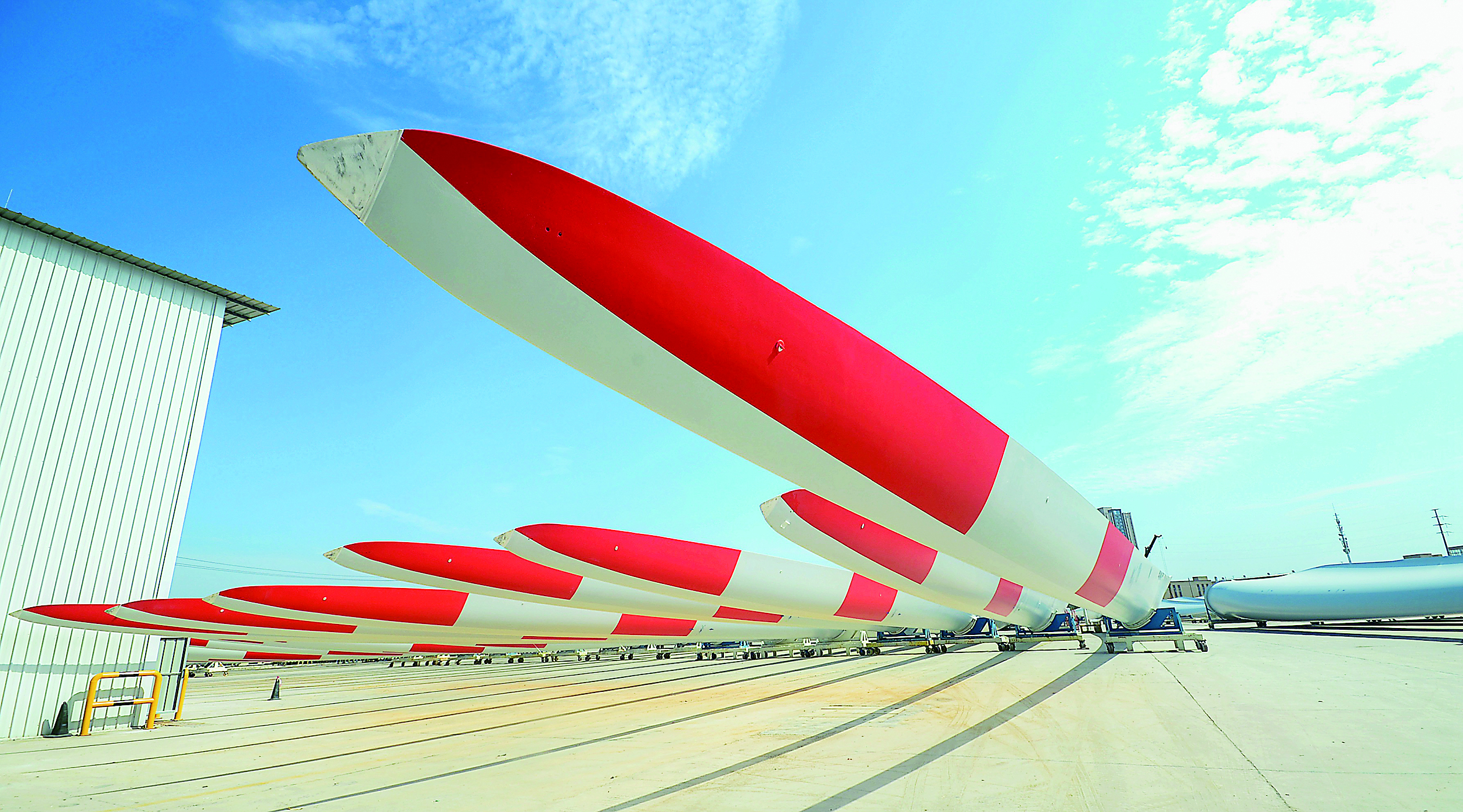 厂区整装待发的风电叶片。时代新材株洲动力谷厂生产各种型号的叶片,长的达到76米,短的也有59米,最重的达18吨。