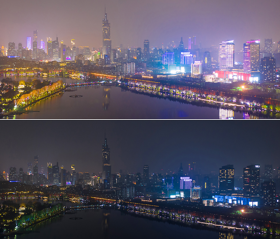 3月27日晚,各地多处建筑参与“地球一小时”环保活动。“地球一小时”活动是世界自然基金会于2007年发起的一个全球活动,号召个人、社区、企业和政府在每年3月最后一个星期六的20时30分至21时30分关闭不必要的电源,以表明对保护地球的支持。图为3月27日拍摄的熄灯前后的南京玄武湖畔建筑的对比。
