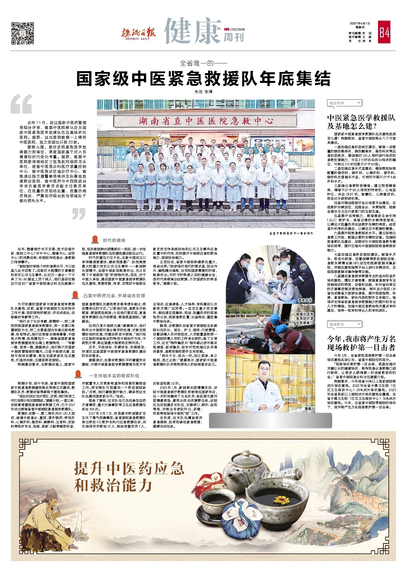 根据计划,到今年底,省直中医院国家级中医紧急救援基地将在株洲正式建成,救援队队员、救援设备等都将于基地集结。