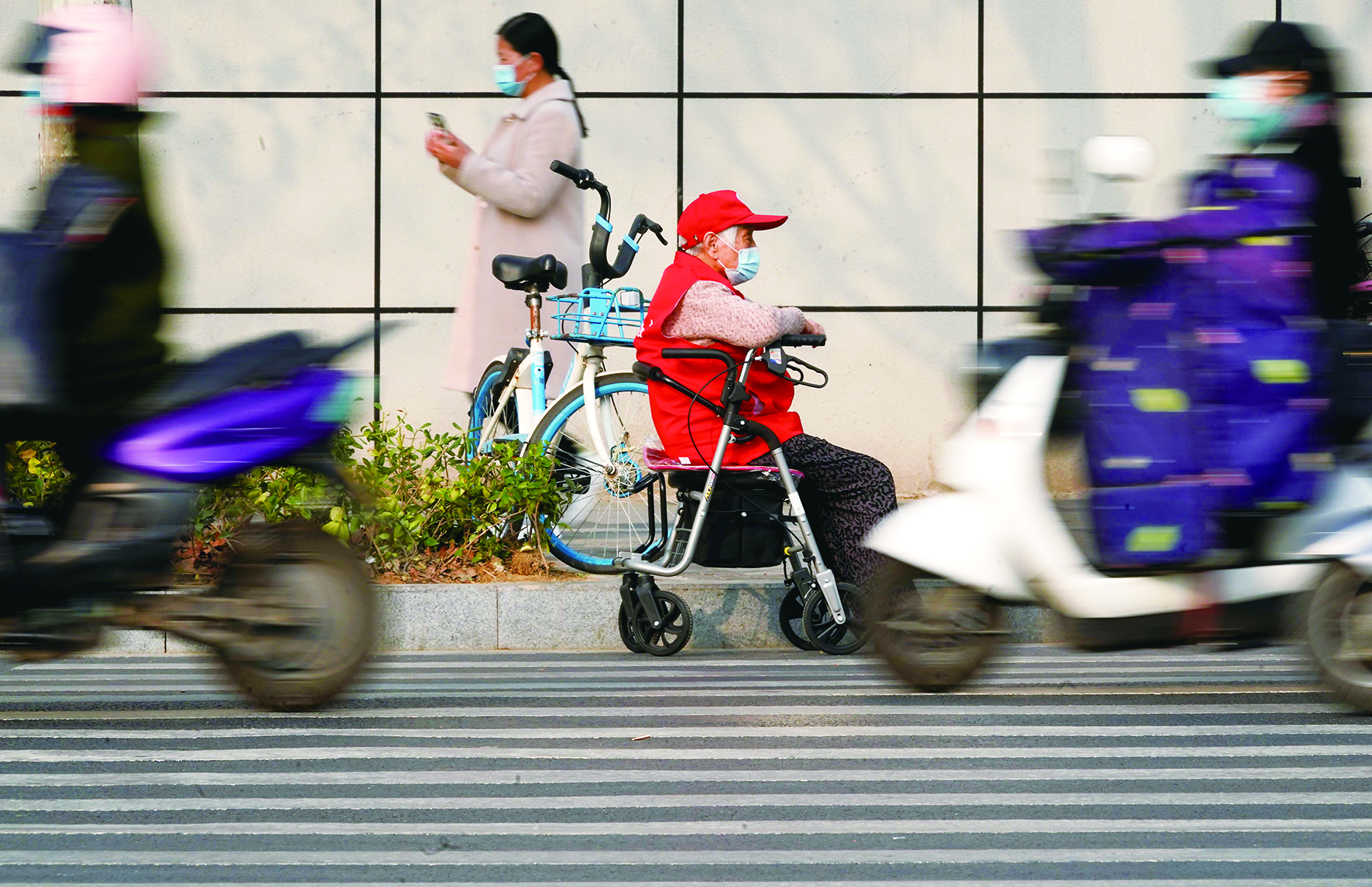 左春秀去往郑州火车站西广场志愿服务站的途中,在等红灯的同时坐在小车上休息(3月25日摄)。