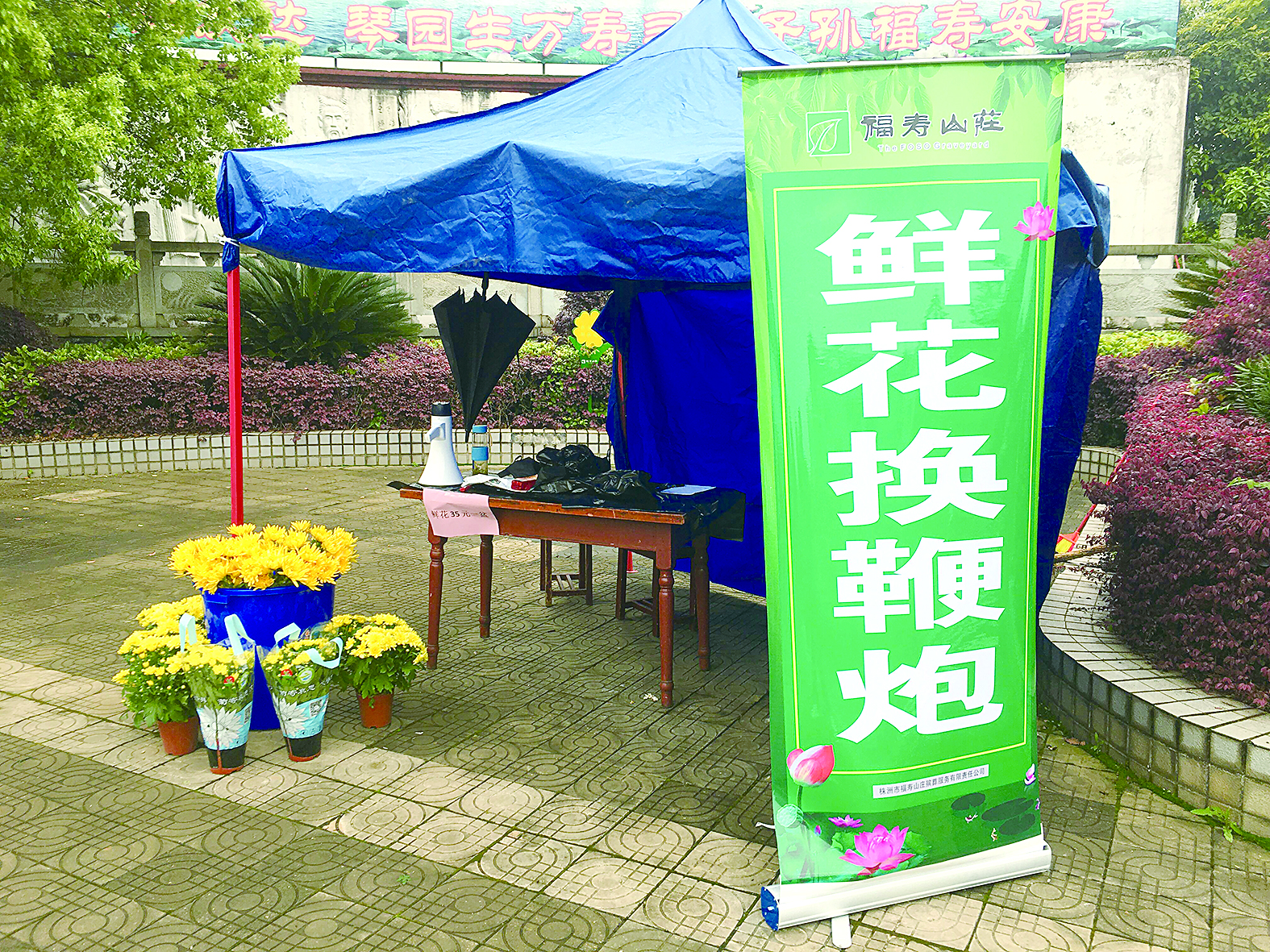 陵园内设立鲜花换鞭炮服务点。 刘平 摄