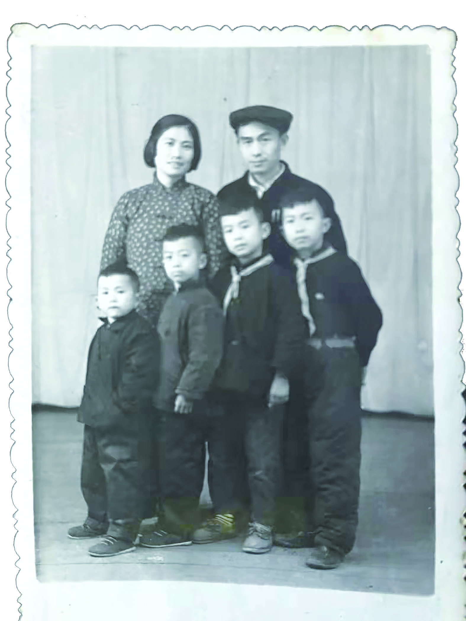 上世纪六十年代,正在读小学的作者(右一)和父亲(后排右)及家人合影