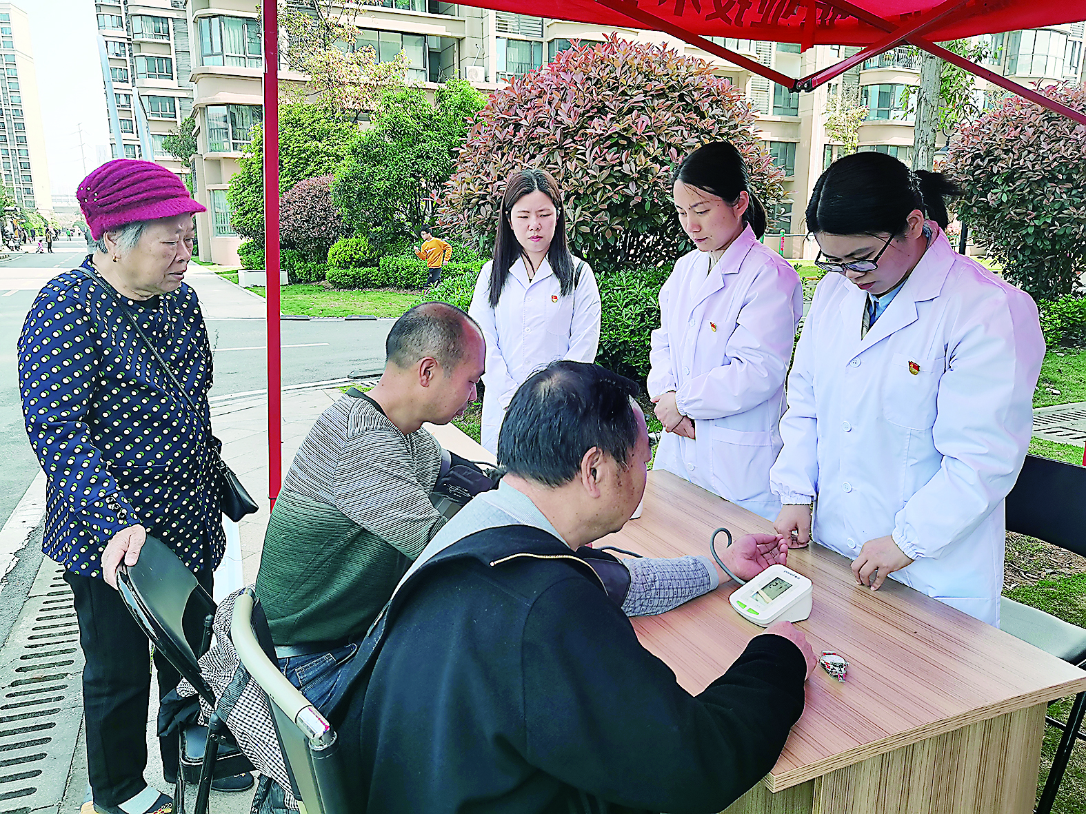 云龙示范区学林街道香樟社区党员干部、志愿者深入小区,为居民进行健康检查。刘玲 供图