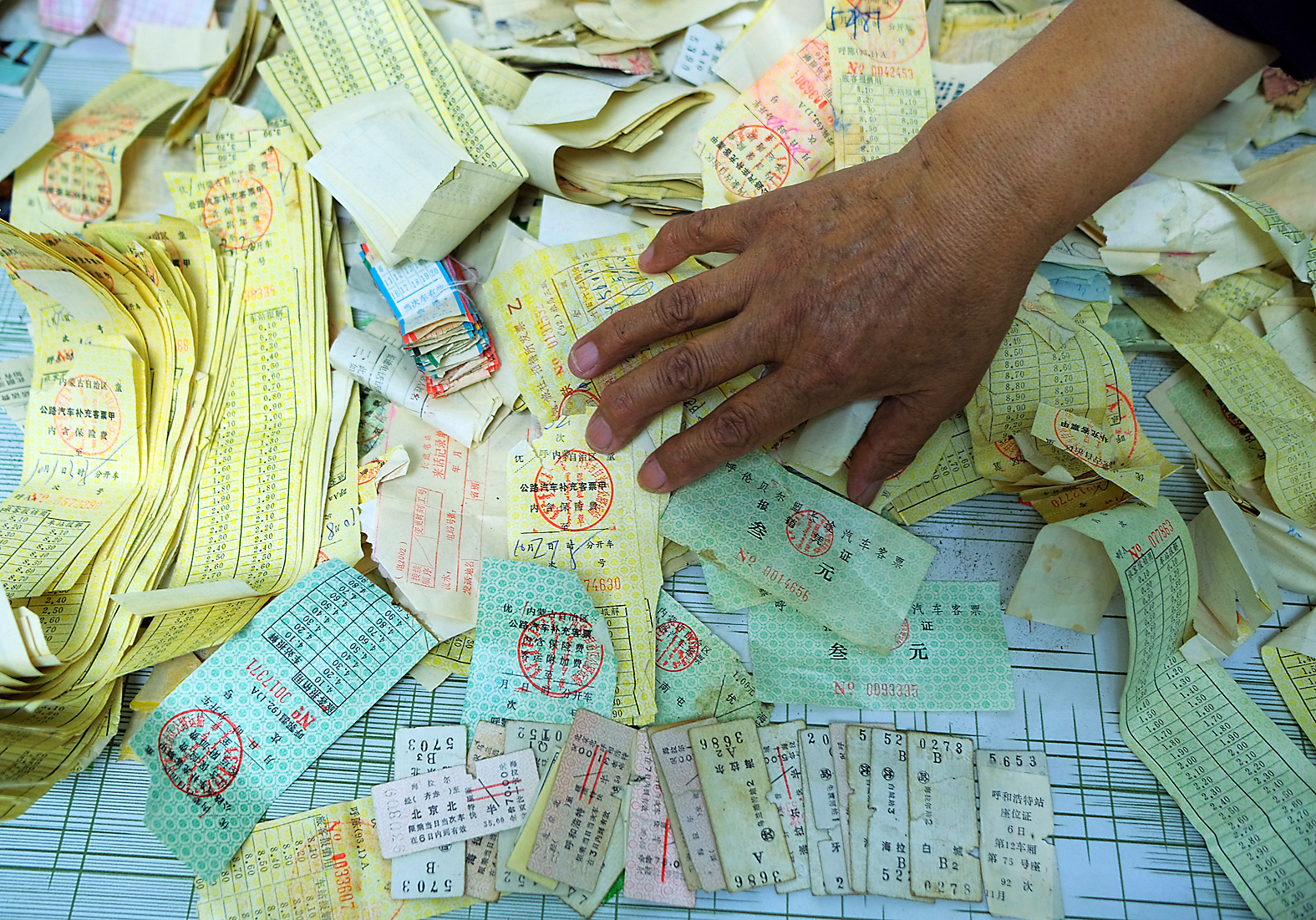 受害人白某春的母亲整理20多年反映问题期间,乘坐交通工具使用的车票(2020年9月25日摄)。 新华社发