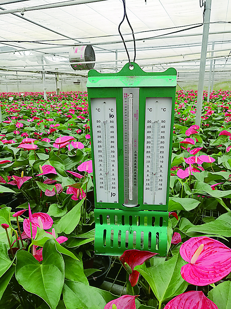 偌大的大棚内,红掌数量达到10万盆。大棚内,每隔几十米,就摆设着一台干湿球温度计。“你看,温度22.5℃,湿度86,今天气温不高,湿度适宜,所以不用开空调,喷淋、喷雾系统都不需要开,只要打开内循环即可。”唐嘉雨说。
