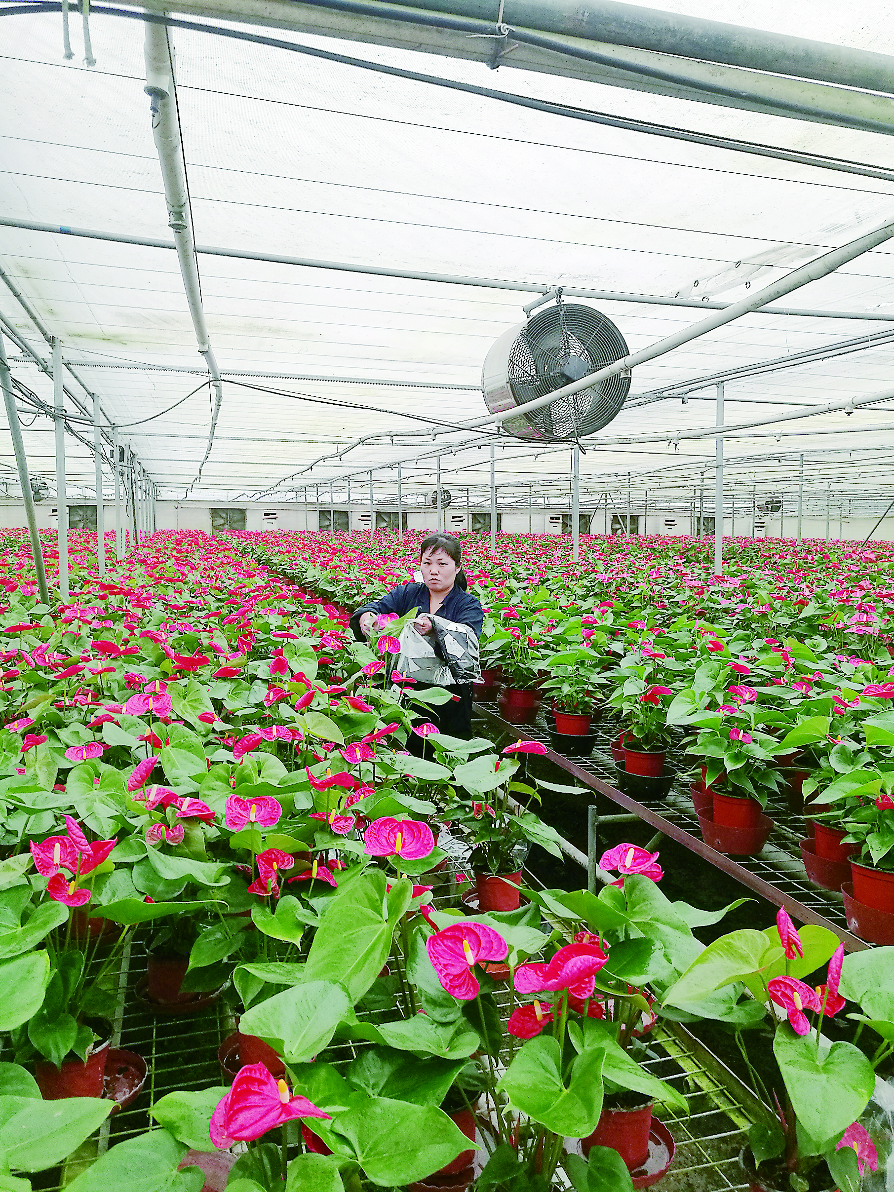 10号大棚面积达5000余平方米,高约1米的铁架上,密密麻麻摆满了各类盆栽红掌,绿的叶、红的花、粉的花柱,煞是好看。
