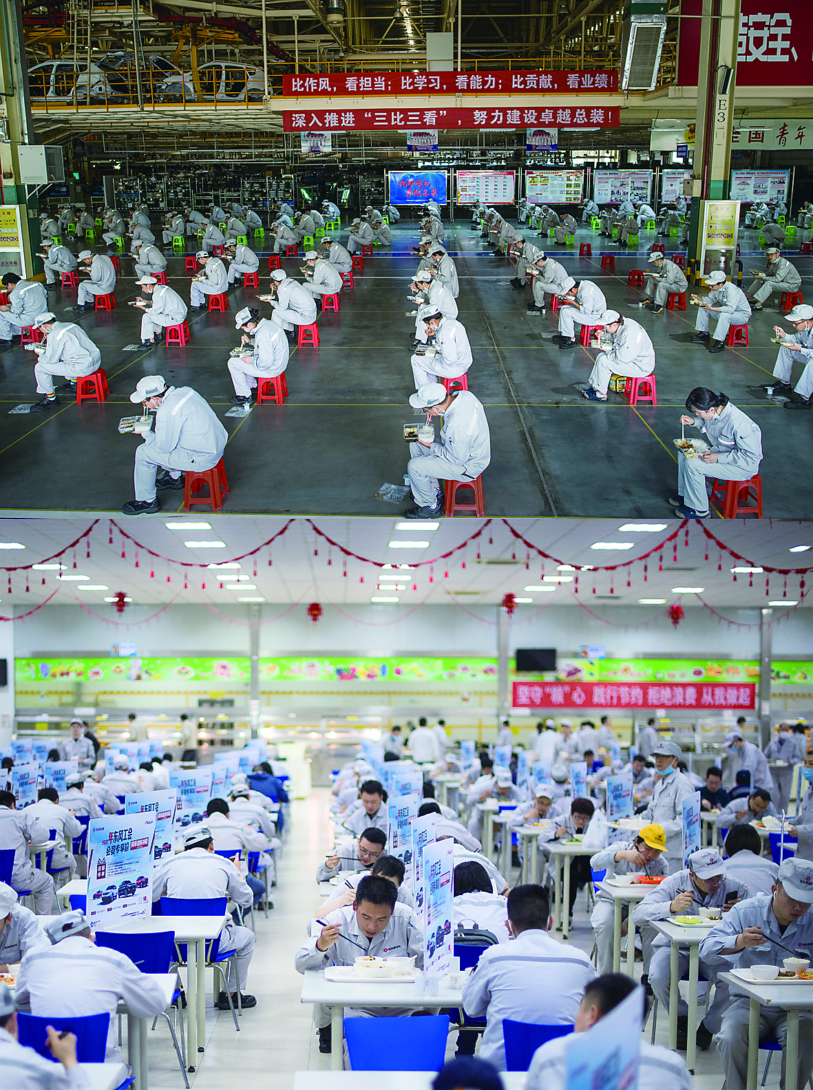 这是一张拼版照片,上图为:2020年3月24日,在武汉市东风乘用车公司工厂总装车间,工人们保持两米的距离吃午饭;下图为:2021年3月30日,工人们在武汉市东风乘用车公司食堂吃午饭。 新华社发