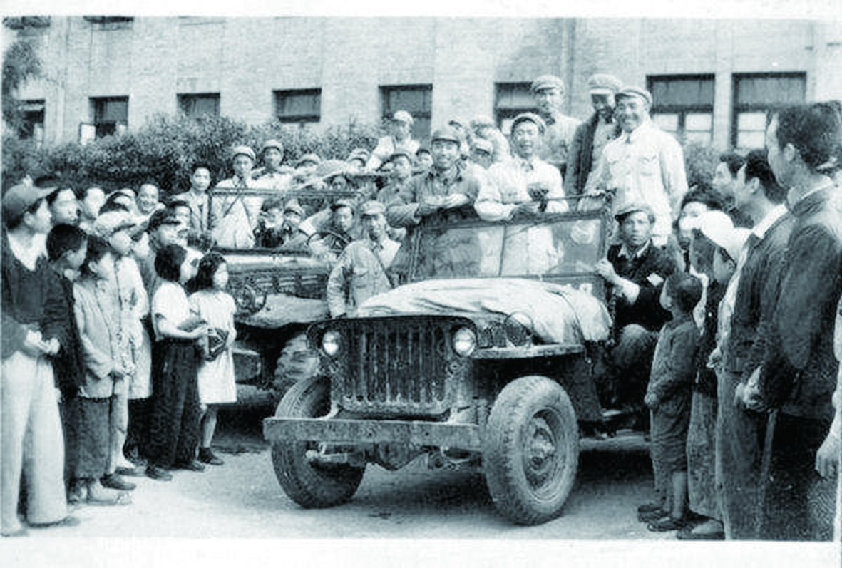 1949年5月,郭鹏任军长的第一野战军1兵团2军领导在陕西武功农学院动员知识青年参加解放军。站在吉普车上左起:王震、郭鹏、张希钦、王恩茂、顿星云。
