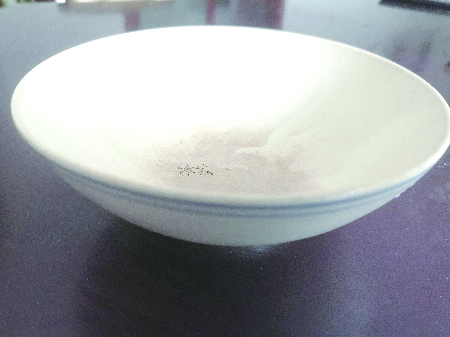 父亲离开我们已经四十多年了,除了脑海里模糊的印象和我偷偷藏起他的一本手写笔记本,连一张照片都没有。没想到,现在我居然和他留下的一个碗相遇了,难怪那碗汤那么鲜美。我用双手捧起碗,小心翼翼的,生怕自己不小心把碗打破。这个碗除了旧了点,没有任何破损的痕迹。浅白为底色,碗外沿有两圈蓝色的横条纹,一条宽些,一条窄些。碗底有点陈年褐色的印迹,一个由点点组成的完完整整的“松”字就在碗底。