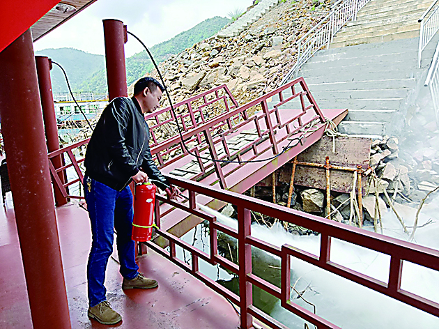 演练现场,一艘载着数十名乘客的游船从旅游码头出发,行至水库中央时,因船上游客吸烟,引发火灾。船上工作人员立刻向水库管理局求救。洮水水库应急救援队接到求救电话后,在指导船员利用灭火器自救的同时,立即接通码头消防设施,不到2分钟就将火势扑灭。