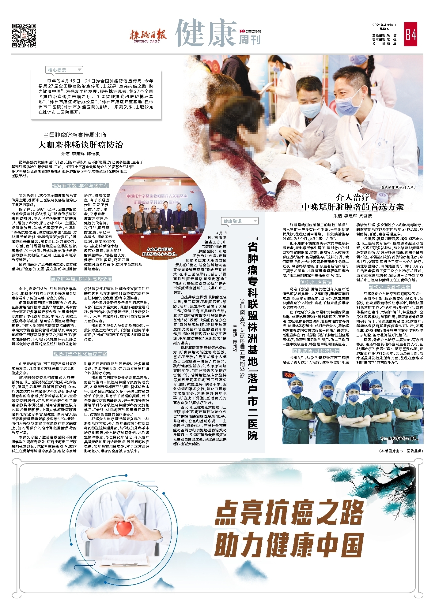 省肿瘤医院副院长谌永毅认为,打赢肿瘤防治这场攻坚战,重点在于防。“要树立每个人都是自己健康第一责任人的理念,践行健康生活方式,积极预防癌症的发生。”而为推动优质医疗资源下沉,省肿瘤医院专家坚持每周五定期来株洲市二医院坐诊,进行教授查房、联合手术、业务培训和学术交流,深化开展新技术新业务,不断提升医疗水平,打造上下贯通、互通有无的高效优质肿瘤诊疗平台。