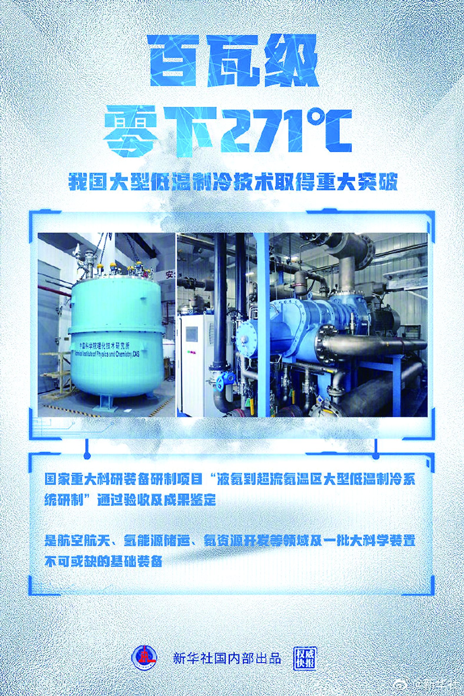 近日,国家重大科研装备研制项目“液氦到超流氦温区大型低温制冷系统研制”通过验收及成果鉴定,标志着我国具备了研制液氦温度(零下269摄氏度)千瓦级和超流氦温度(零下271摄氏度)百瓦级大型低温制冷装备的能力。