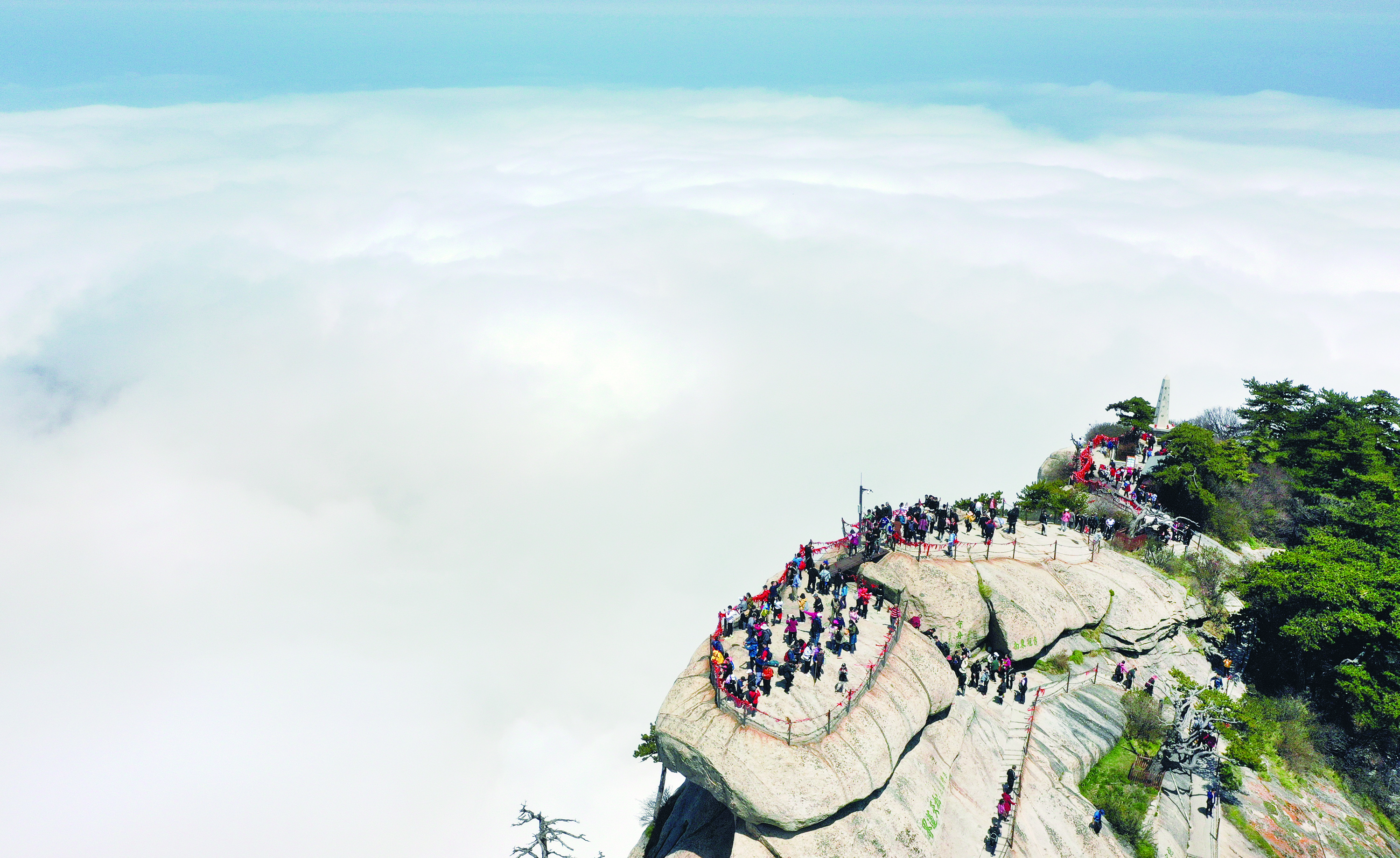 4月22日,游人在云海中的华山景区西峰顶游览。