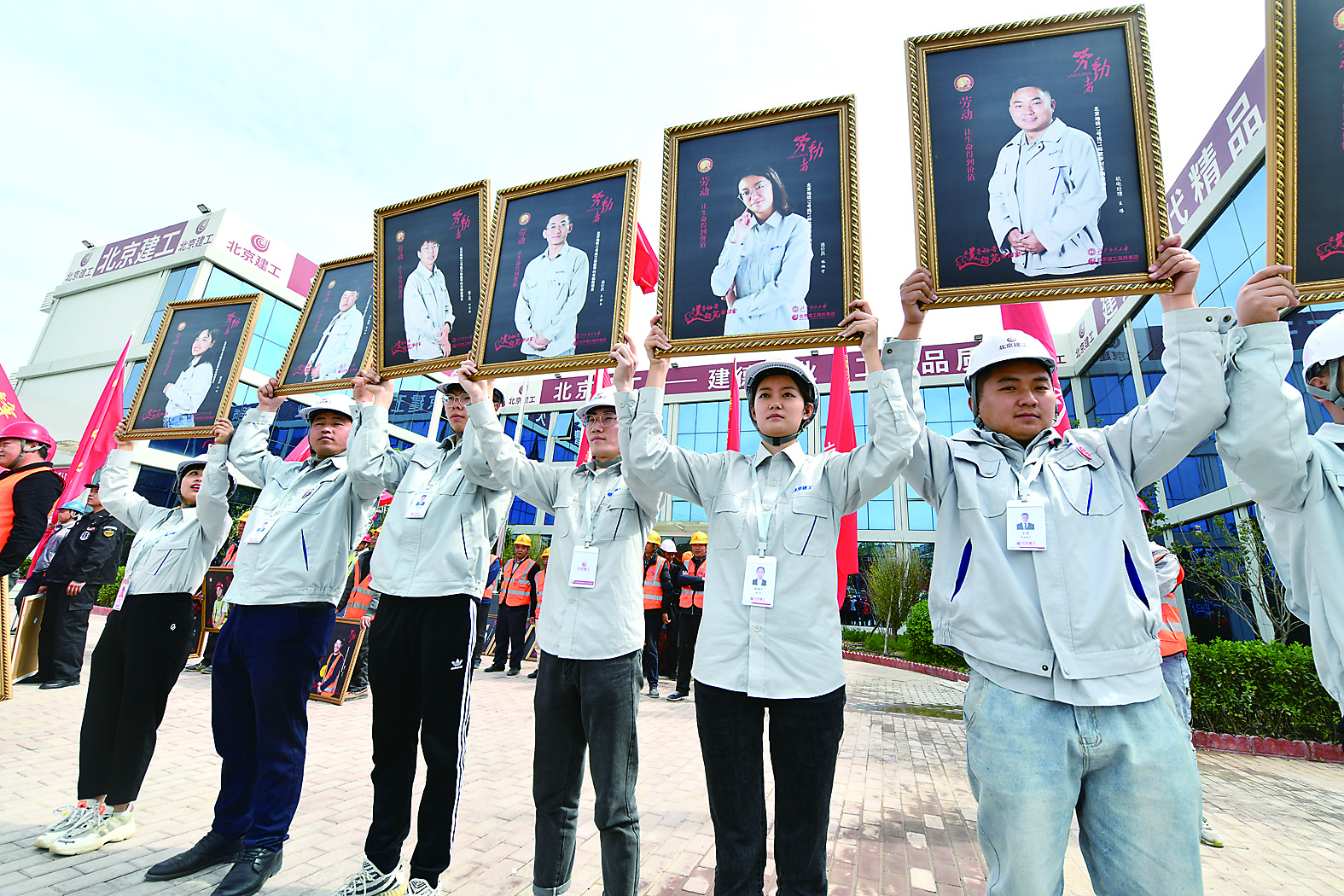 4月28日,由北京市总工会主办的“首都劳动者微笑迎‘五一’暨创新实干勇争先劳动竞赛”,在北京建工集团地铁歇甲村车辆段项目部举行,参与北京市轨道交通建设的劳动者获赠自己的微笑照片,迎接属于自己的节日。图为劳动者展示自己的微笑照片。 新华社发