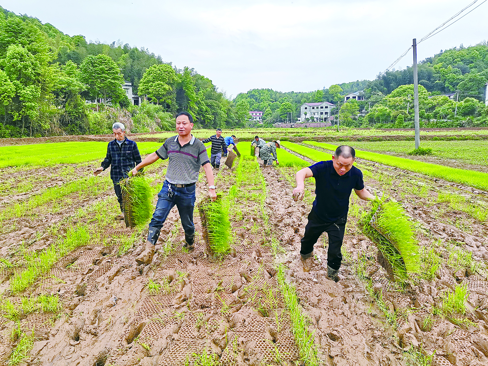 当天虽阴雨绵绵,气温只有15℃,大家却干得热火朝天。在几位老干部的指导下,众人卷着裤腿、光着脚板,赤脚踩进了泥泞的田地里,有的拔苗,有的运苗,有的插苗……30多个乡镇干部加上黄陂田村的村民志愿服务队,不一会儿功夫,10来亩水田全都披上了绿色的“新装”。