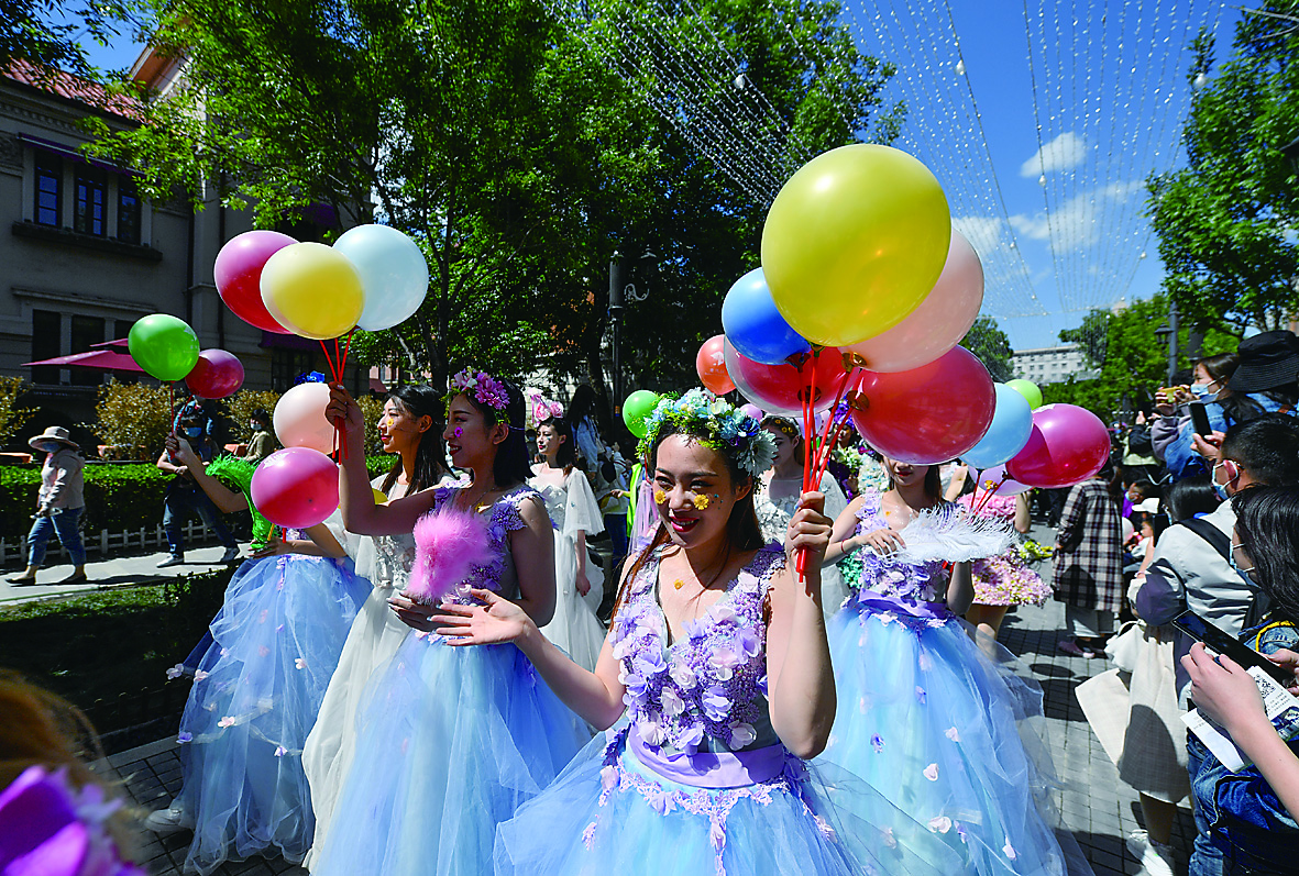 “五一”小长假期间,人们以不同方式放松心情、欢度假日。当日,在天津市河北区意式风情街,演员在街区巡游,许多游客趁着假期来此游玩,享受休闲时光。 新华社发
