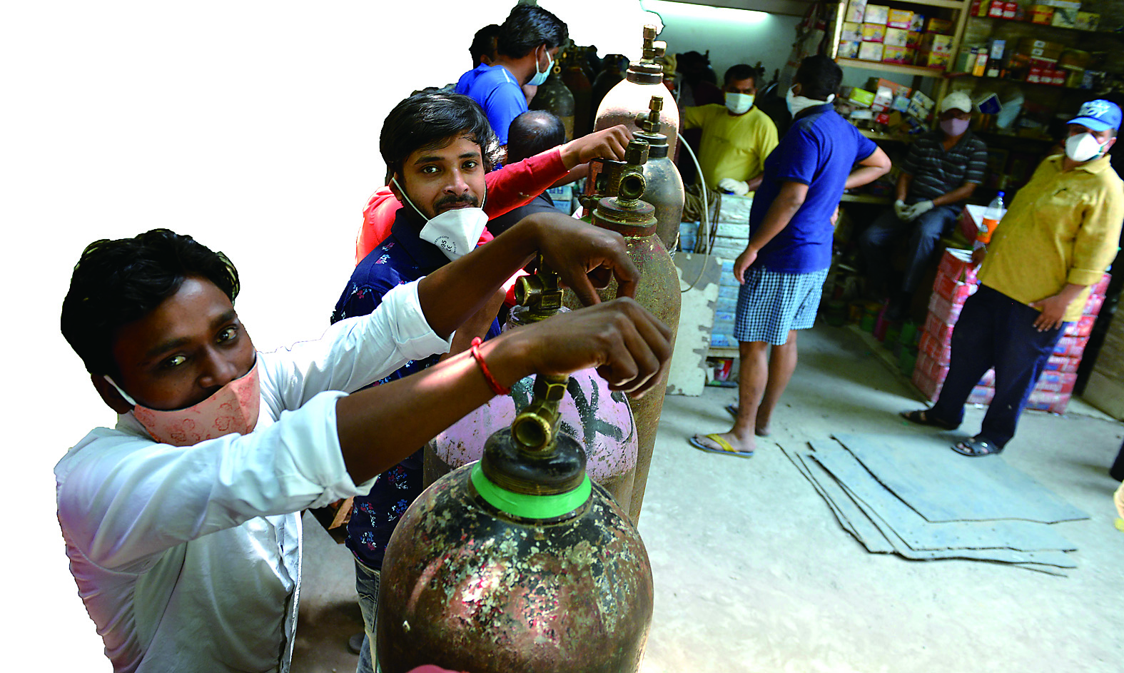 5月5日,人们在印度新德里等待填充氧气瓶。