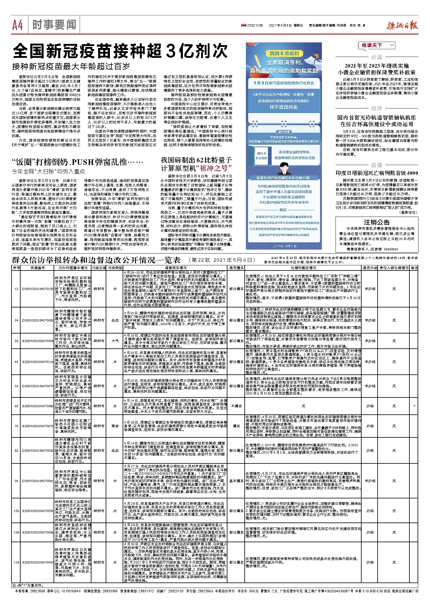 未办结无38X2HN202104270098株洲市岳塘区中南石材市场内十家石材加工作坊,无环保设施,露天作业,扬尘扰民。株洲市大气4月29日,荷塘区污染防治攻坚战指挥部协同生态环境荷塘分局、月塘街道办事处赴现场开展了调查核实。经核实,该举报件部分属实。其中中南石材市场内十家石材加工作坊,无环保设施、露天作业问题不属实;扬尘扰民问题属实。部分属实处理情况:4月29日,桂花街道办事处协同生态环境局荷塘分局对中南石材市场进行了现场检查,并要求市场管理方加强日常监管,做好划行规市工作。整改情况:市场方承诺,将做好扬尘防护工作,提升市场卫生环境。未办结无43X2HN202104270116株洲市攸县黄丰桥温水村多家养猪场无环保措施,养殖废水直排,污染地下温泉、鱼塘,臭味扰民。当地政府存在包庇、纵容行为。株洲市水4月29日,攸县黄丰桥镇人民政府、市生态环境局攸县分局、县畜牧水产事务中心等相关单位工作人员再次赴现场进行调查核实,经调查,该举报问题部分属实。其中:株洲市攸县黄丰桥镇温水村多家养猪场无环保措施,养殖废水直排,污染地下温泉、鱼塘,当地政府存在包庇、纵容行为不属实;株洲市攸县黄丰桥镇温水村养猪场生产废水经处理设施处理后排放至附近小溪,臭味扰民属实。部分属实处理情况:1.责令温水村生猪散养户(存栏25头以下)自查自检,及时清理粪污,确保粪污无直排及渗漏现象。2.责令温水村对散养户(存栏50头以下)加强宣传、监管,引导散养户将粪污及时还田还土,确保粪污不出现直排、渗漏现象。3.责令各养殖场完善相关手续,保证水处理设施正常运转,确保环境安全。4.由市生态环境局攸县分局对源钱养殖场、等下养殖场超标排放进行立案查处。 整改情况:无。 未办结无54D2HN202104270079株洲市茶陵县火田镇贝水村龙兴纸业废水直排,焚烧烟尘、臭味严重扰民。以停产逃避督察组检查,存在包庇、纵容行为。株洲市水4月29日,市生态环境局茶陵分局会同火田镇政府工作人员到现场进行调查,经核实,该举报情况部分属实。其中:废水直排,焚烧烟尘严重扰民和以停产逃避督察组检查,存在包庇、纵容行为问题不属实,臭味扰民的问题属实。部分属实处理情况:株洲市生态环境局茶陵分局已向龙兴纸业下达《责令限期整改通知书》,责令企业立即制定切实可行的整改方案,污泥压滤车间按要求安装恶臭气体去除装置或采取其他有效的污染防治措施。 整改情况:认真督促企业全面落实整改要求,有序推进整改工作,确保在2021年6月30日之前完成整改任务。未办结无60X2HN202104270080株洲市茶陵县经开区污水处理厂进厂污水管网、检查井严重溢漏污水,沿途上千亩农田遭污染。株洲市水4月14日,茶陵县经开区、县住建局、利民办事处、污水处理厂、齐溪村、三组组长及代表共同查看了现场,经现场调查核实,该举报情况不属实。污水管网经整改后,现在没有溢漏污水现象。且经过现场勘查,并无上千亩农田遭污染现象,且留有照片为证。不属实无办结无*70X2HN202104270073株洲市荷塘区红旗广场西子花园小区附近中南蔬菜批发市场噪音、臭味扰民。株洲市噪音4月28日,荷塘区分管副区长带领桂花街道办事处、荷塘区商务粮食局、区市场监管局、生态环境局荷塘分局赴中南蔬菜批发市场现场调查核实,经核实,该投诉情况属实。属实处理情况:4月29日,荷塘区桂花街道办事处协同生态环境局荷塘分局对中南蔬菜批发市场进行了现场检查,并要求市场运营方高度重视市场环境问题,不能对周边环境构成影响。整改情况:市场方承诺,日后若还有施工建设,会尽量避开午休和晚上,同时告知周边居民,争取群众的谅解,同时会继续加强市场垃圾清运管理工作,确保不产生异味,影响周边群众的正常生活。目前,该处工程已完成建设。办结无82D2HN202104270022株洲市醴陵市阳三街道办事处企石村干部刘某泉违法修改别墅,破坏生态环境,毁林毁草,填埋水库,毁坏农田30多亩,当地政府存在包庇、纵容行为。株洲市生态4月14日,醴陵市阳三石街道办事处组织醴陵市自然资源局、醴陵市林业局等部门调查核实,经调查核实,该举报情况部分属实,其中反映“违法修改别墅,破坏生态环境,毁林毁草,填埋水库,毁坏农田30多亩”的问题属实;“当地政府存在包庇、纵容行为”的问题不属实。部分属实处理情况:1.2017年,醴陵市自然资源局对刘锡泉进行了行政处罚。2.2019年,中共醴陵市纪委对刘锡泉同志给予党内严重警告处分。整改情况:2019年8月3日,主体房屋建筑已全部强制拆除,并组织进行了复绿。办结无96D2HN202104270061株洲市芦淞区中心路廖家湾的塑料破碎加工厂非法经营,污水直排农田、噪音、异味扰民,易燃塑料物品随意堆放,存在安全隐患。株洲市水4月27日,市生态环境局芦淞分局执法人员对芦淞区耀能再生资源加工厂进行了亮证执法检查。经查,该投诉问题基本属实,且与第二十一批D2HN202104260078号交办件重复。1.关于该加工厂非法经营、噪音、异味扰民、易燃塑料物品随意堆放的问题属实。该厂未办理完成环评审批手续,存在未批先建的问题。该厂在生产期间,产生少量噪音、臭气,且厂外存在塑料制品露天堆放现象;2.关于污水直排农田的问题不属实。该厂建有污水处理设施,污水经处理后循环利用,现场未发现外排迹象,察看周边农田、水沟,也未发现有污水迹象。基本属实 处