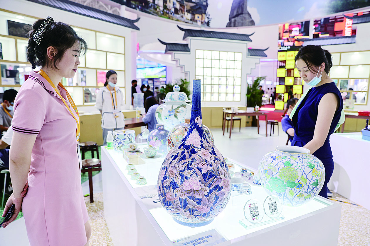 ◀5月10日,观众在消博会现场参观景德镇陶瓷。 新华社记者 张丽芸 摄