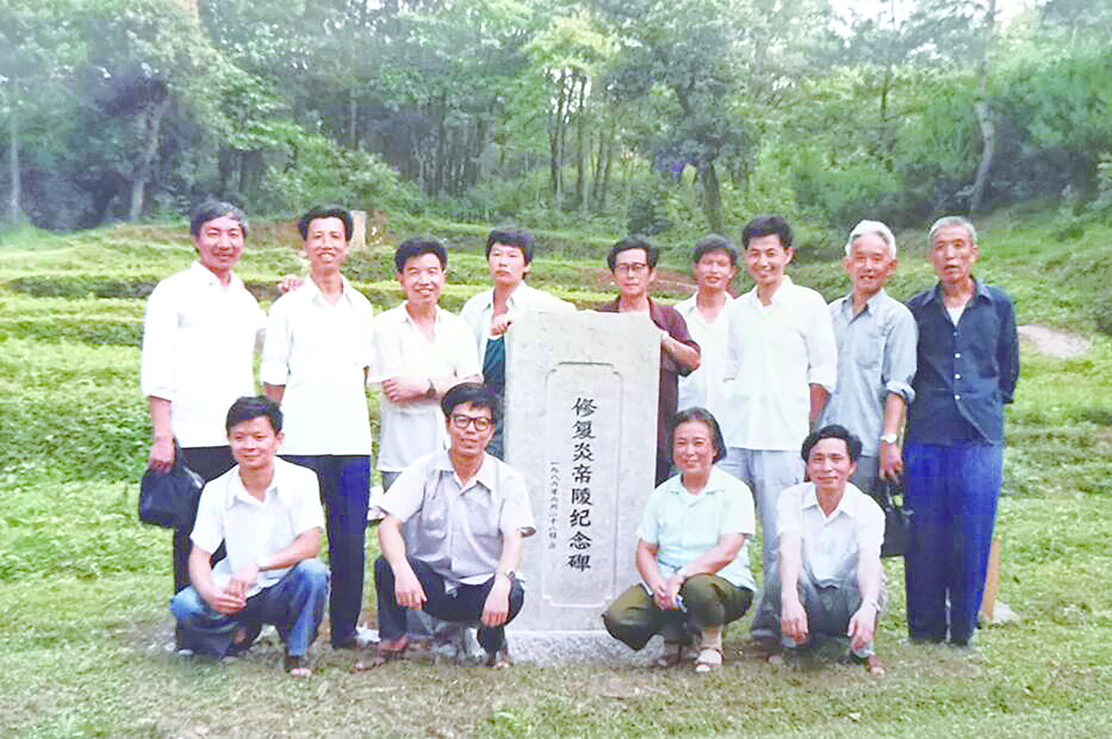 炎帝陵修复工程开工前,立下了一块纪念碑。后排右三为唐家钧。(赖杰琦 翻拍)