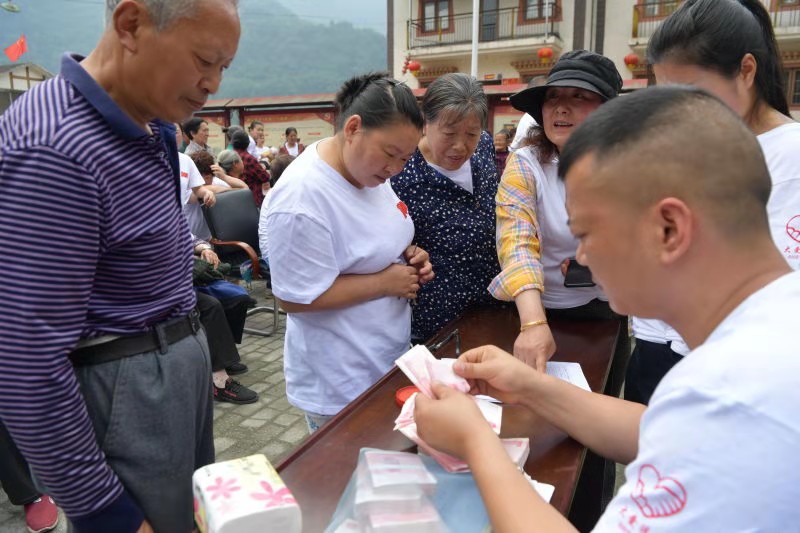 图为当日四川省汶川县映秀镇渔子溪村民在领取分红。