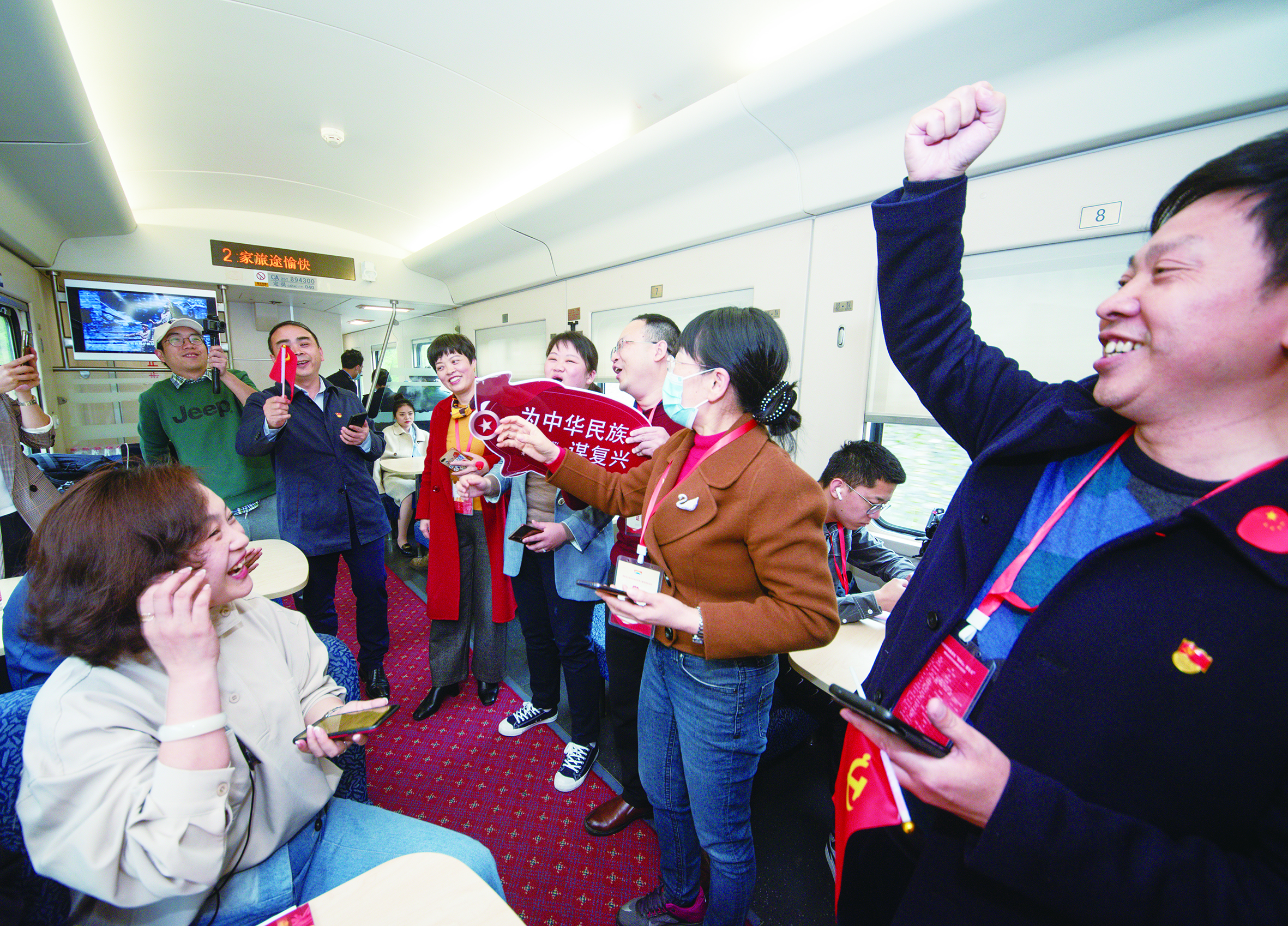 4月10日,在湘赣边红色专列上,省直统战系统的党员们在高唱革命歌曲。 记者 刘震 摄