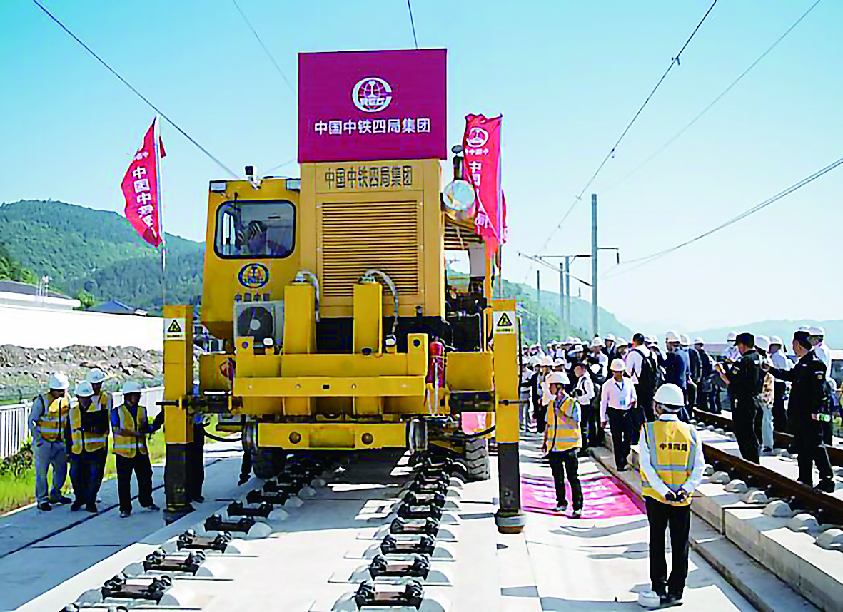 2021年5月8日上午,在张家界张吉铁路施工现场,一段500米的钢轨在全新机组设备作业下顺利铺设到位,标志着全球首套无砟轨道智能铺设机组成功落地。