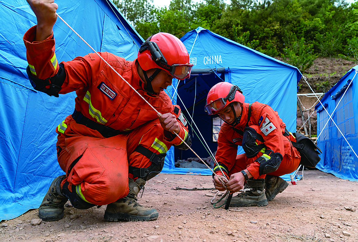 5月22日,两名消防官兵在漾濞县苍山西镇秀岭村固定救灾帐篷。 新华社发