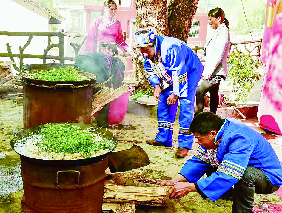 农历“三月三”畲族文化节,洋岐畲族村村民身穿传统畲族服装,在煮地菜鸡蛋。 (受访者供图)