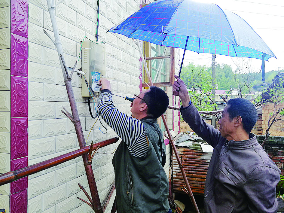 图为任科与另一队员冒雨为仓背村农户更换漏电保护器。 (受访者供图)