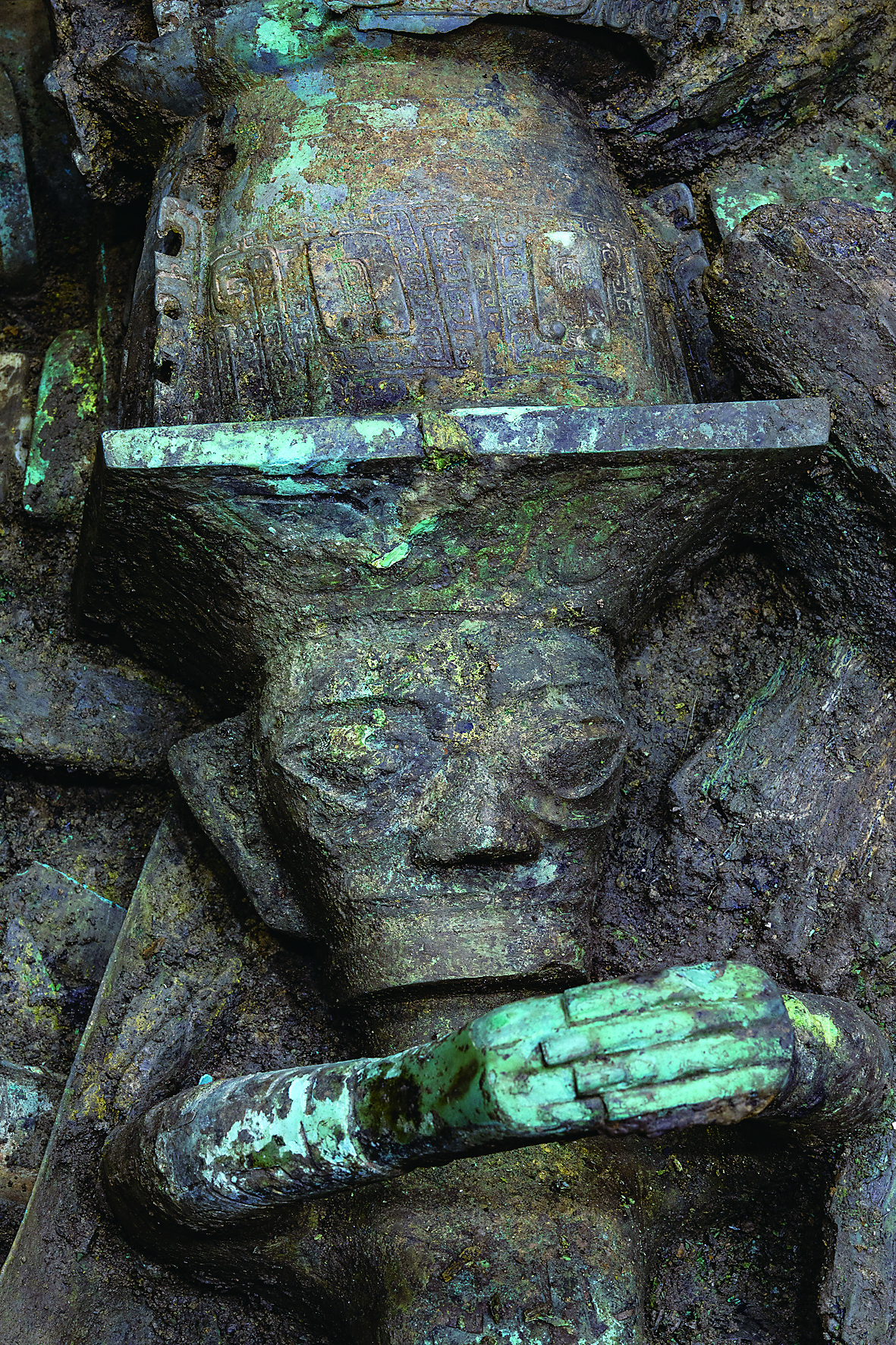 这是在四川德阳广汉市三星堆遗址拍摄的青铜顶尊人像局部(5月14日摄)。