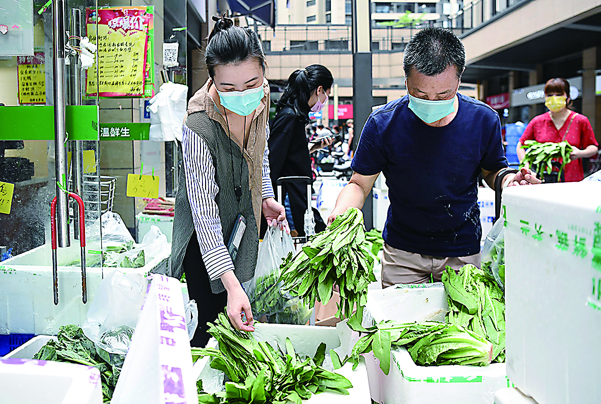 5月30日,市民在广钢新城一小区门店选购蔬菜。 5月30日,记者在纳入严格管控范围的广州荔湾区白鹤洞街道广钢新城看到,群众生活必需品供应保障充足,物价平稳,居民生活有序。 新华社 发