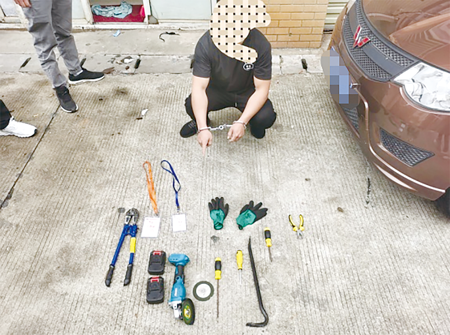现场被收缴的作案工具(前)及作案车辆(右)。通讯员 供图