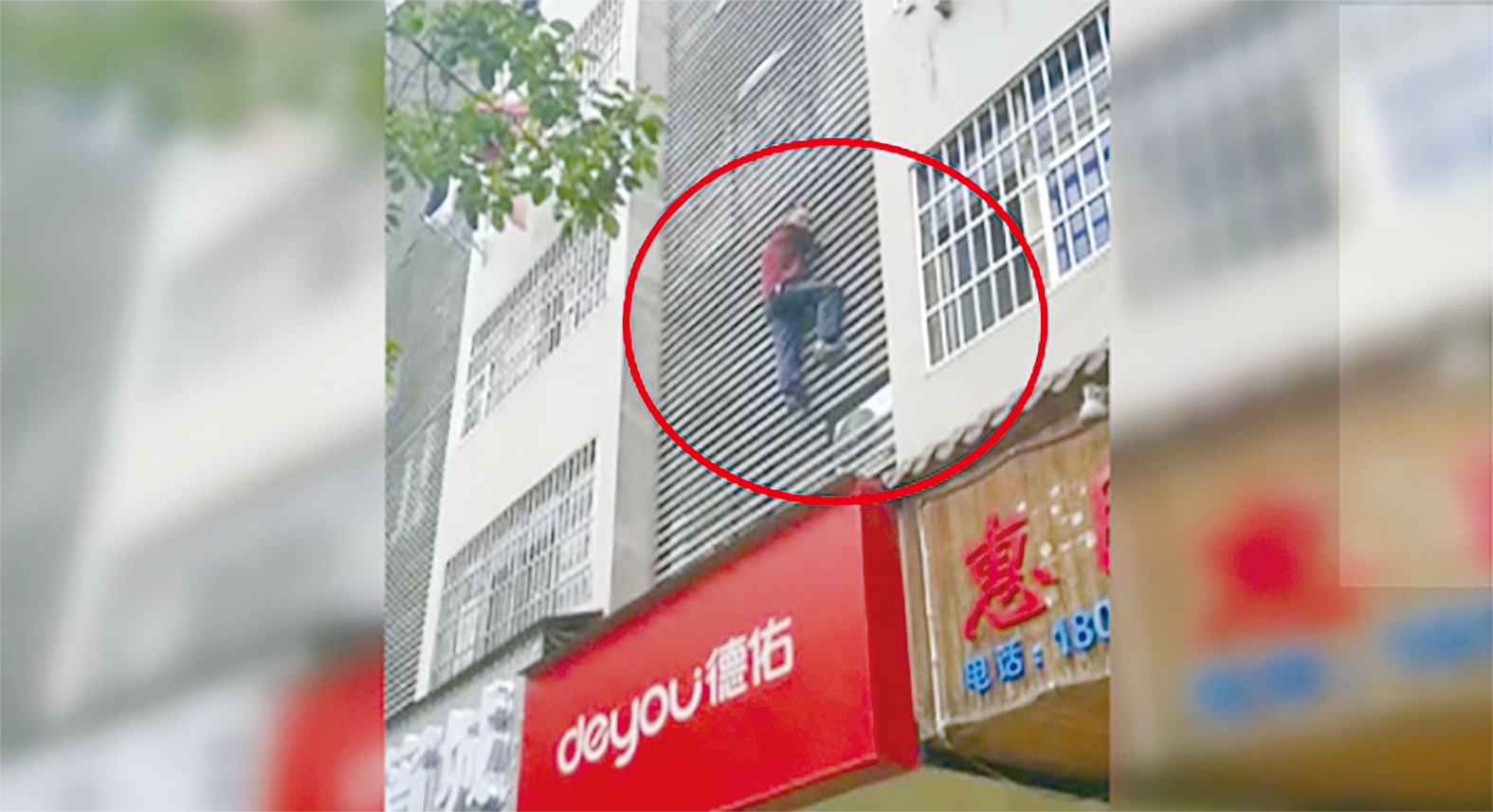 发现楼下被民警包围,嫌疑人挂在墙上进退两难。