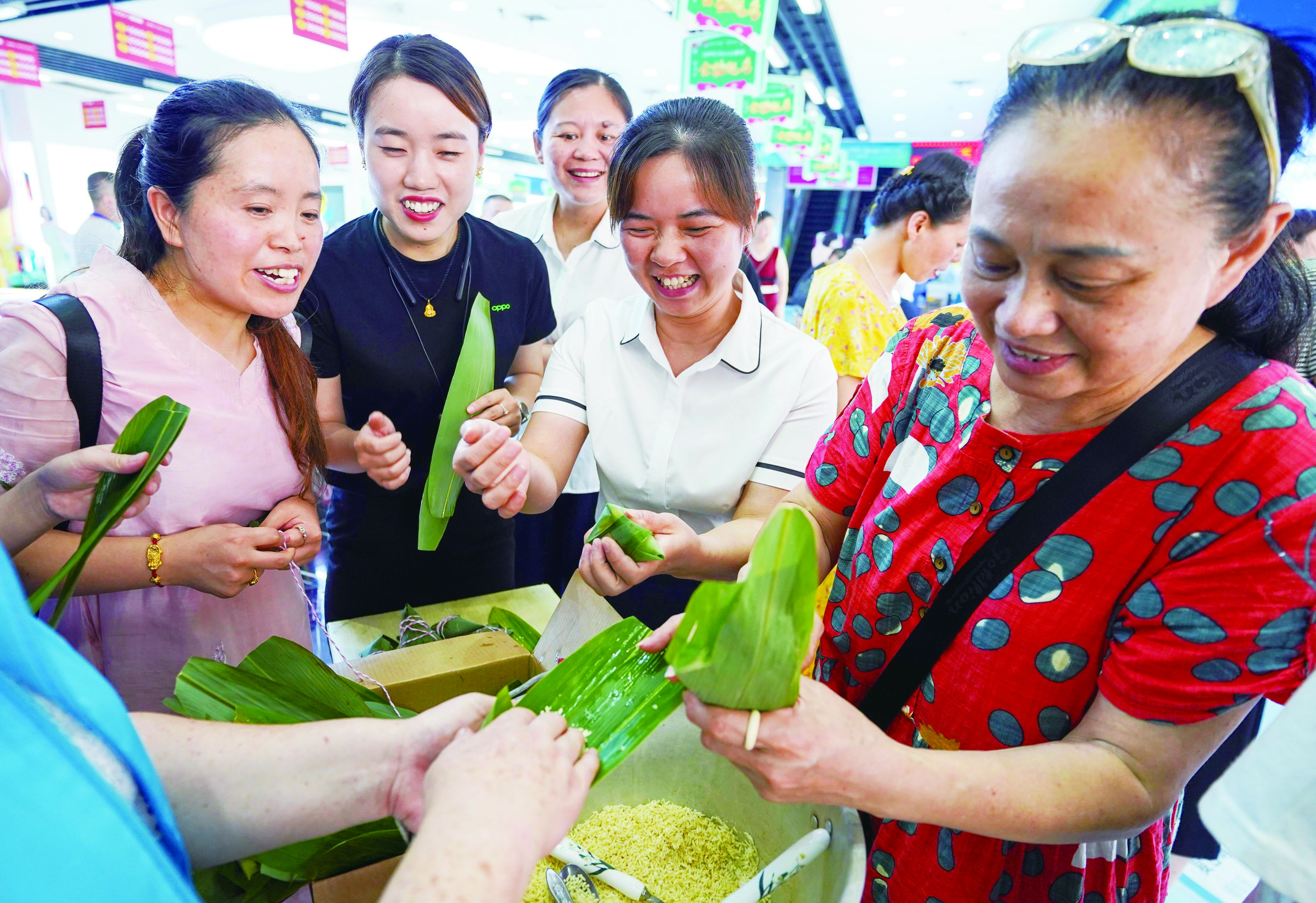 6月12日,在芦淞区家润多广场,株洲晚报志愿者联合会唐果宝宝志愿者服务队与市民一起,举办包粽子趣味比赛。随后,志愿者们将包好的粽子和买来的西瓜作为慰问品,送给在烈日下坚守岗位的环卫工人。 株洲日报·掌上株洲 记者 刘震 摄