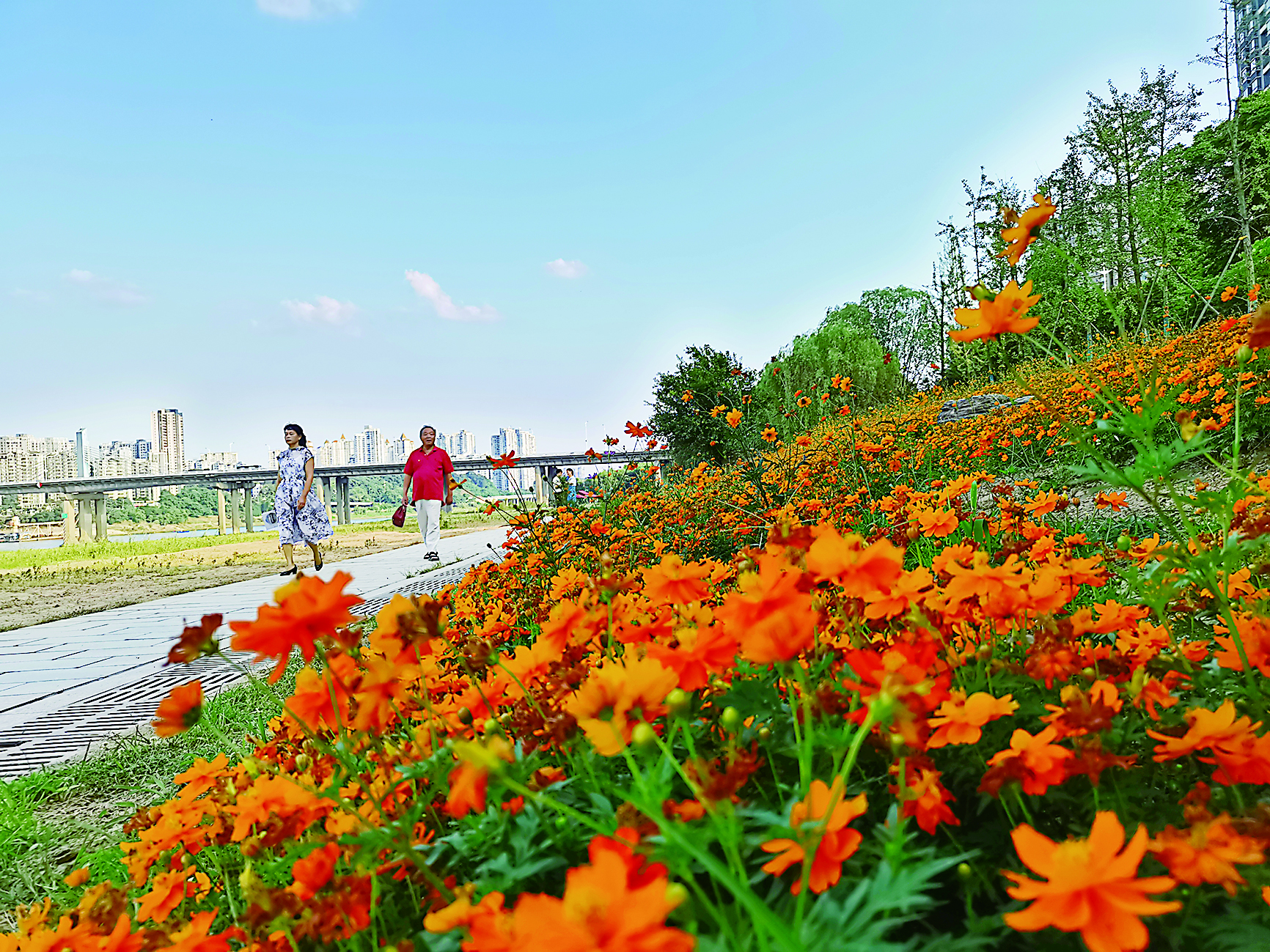 在河西湘江风光带“平沙步月”景区,市园林养护一所湘江风光带项目部撒播的约6000平方米的华菊、波斯菊、百日草等花卉,目前进入盛开期。花期15至20天。图为市民在驻足观赏之余,忍不住拿出手机拍下美景。