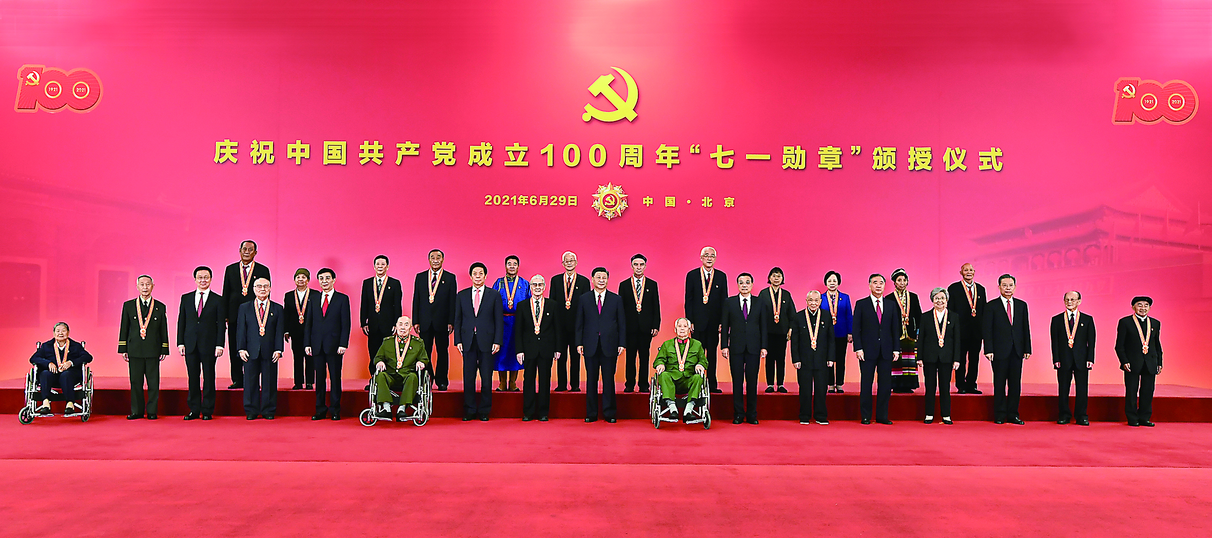 颁授仪式后,习近平等领导同志同“七一勋章”获得者合影留念。