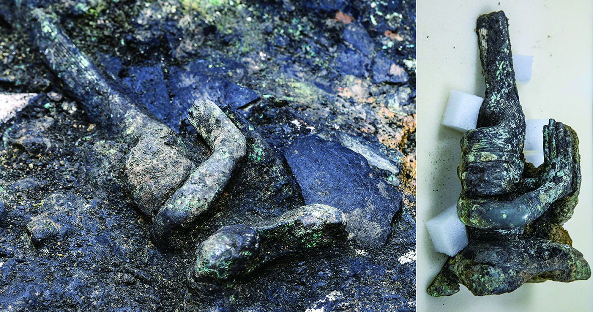 这是一张拼版图片,左图:5月14日在四川德阳广汉市三星堆遗址拍摄的4号“祭祀坑”里的青铜扭头跪坐人像(新华社记者 王曦 摄);右图:5月30日在四川德阳广汉市三星堆遗址拍摄的从4号“祭祀坑”中提取出的青铜扭头跪坐人像。