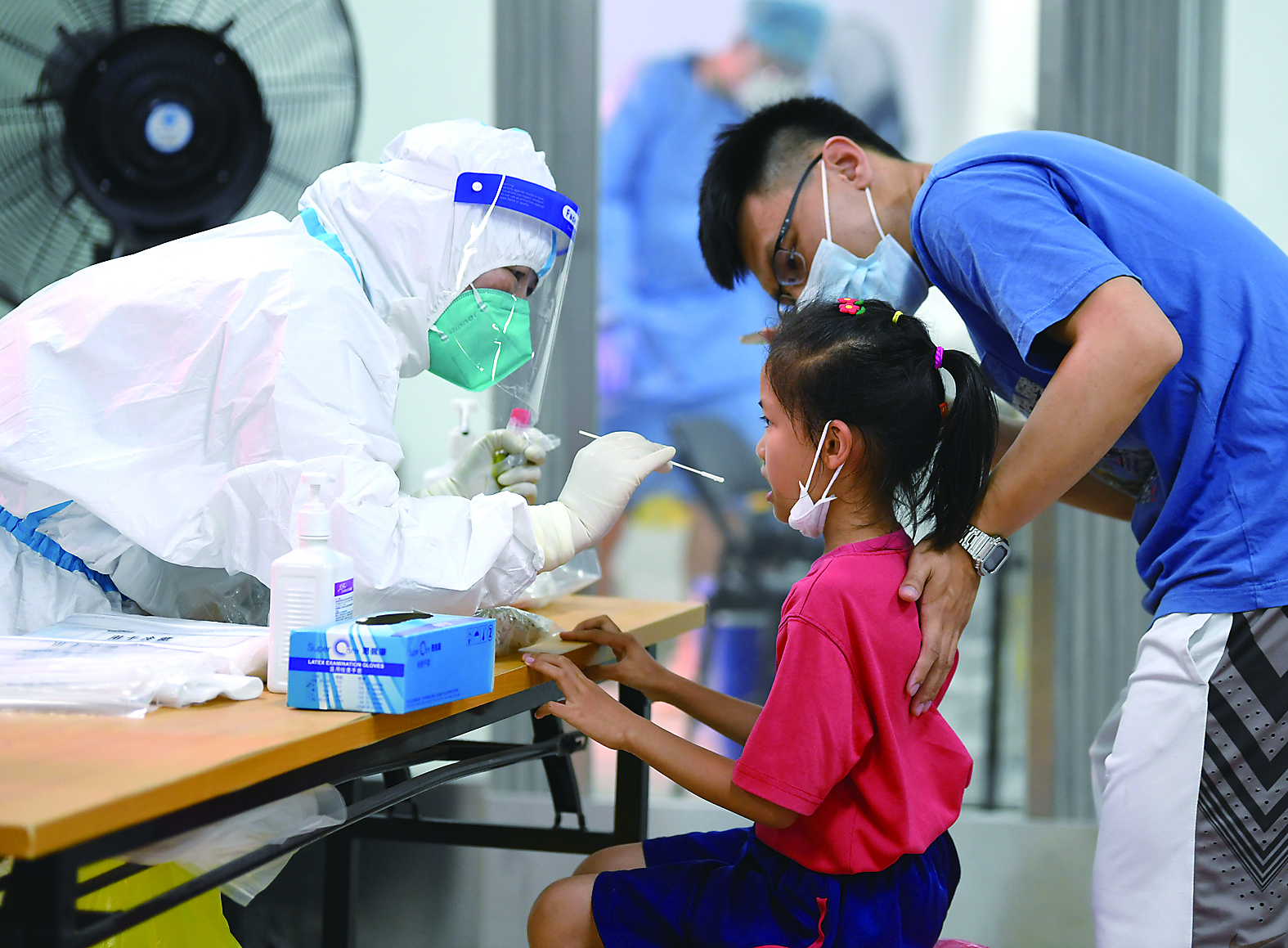 近日,在广州荔湾体育馆核酸检测点,小朋友在家人陪伴下进行核酸检测采样。新华社发