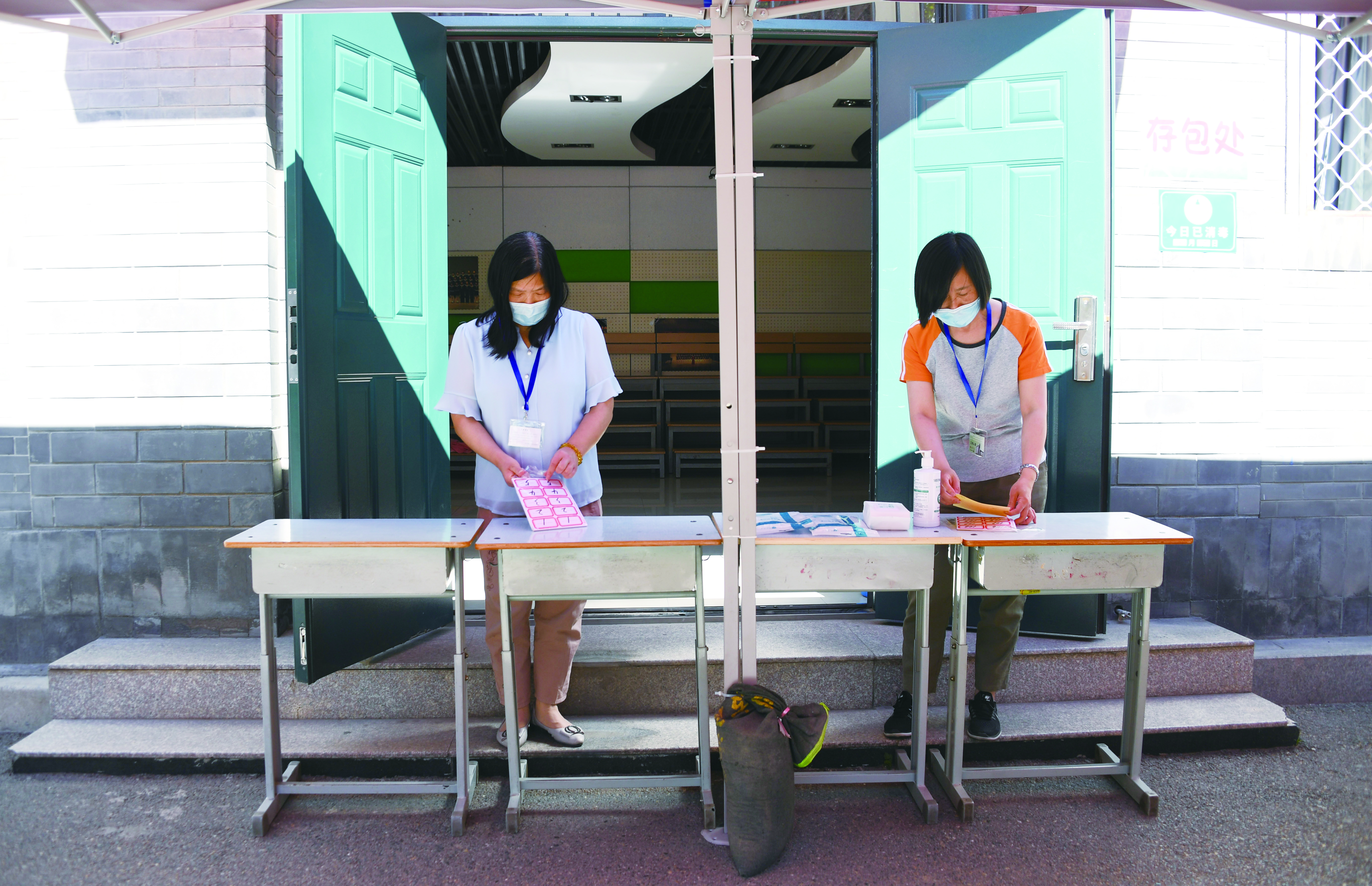 6月5日,在北京实验学校(海淀)考点,工作人员在考生存包处做准备工作。