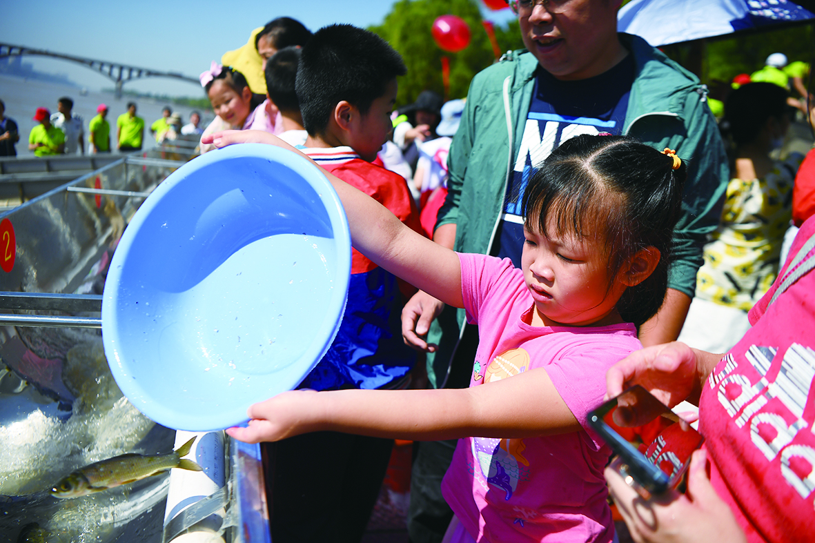 6月6日,市民在长沙橘子洲公园参与放鱼活动。 当日是“全国放鱼日”,湖南同步放鱼活动启动仪式在长沙橘子洲公园举行,现场向湘江放流鱼种约8032万尾。据了解,当天湖南省35个县(市、区)共同开展同步放鱼活动,共向天然水域投放鱼苗鱼种1.35亿尾。