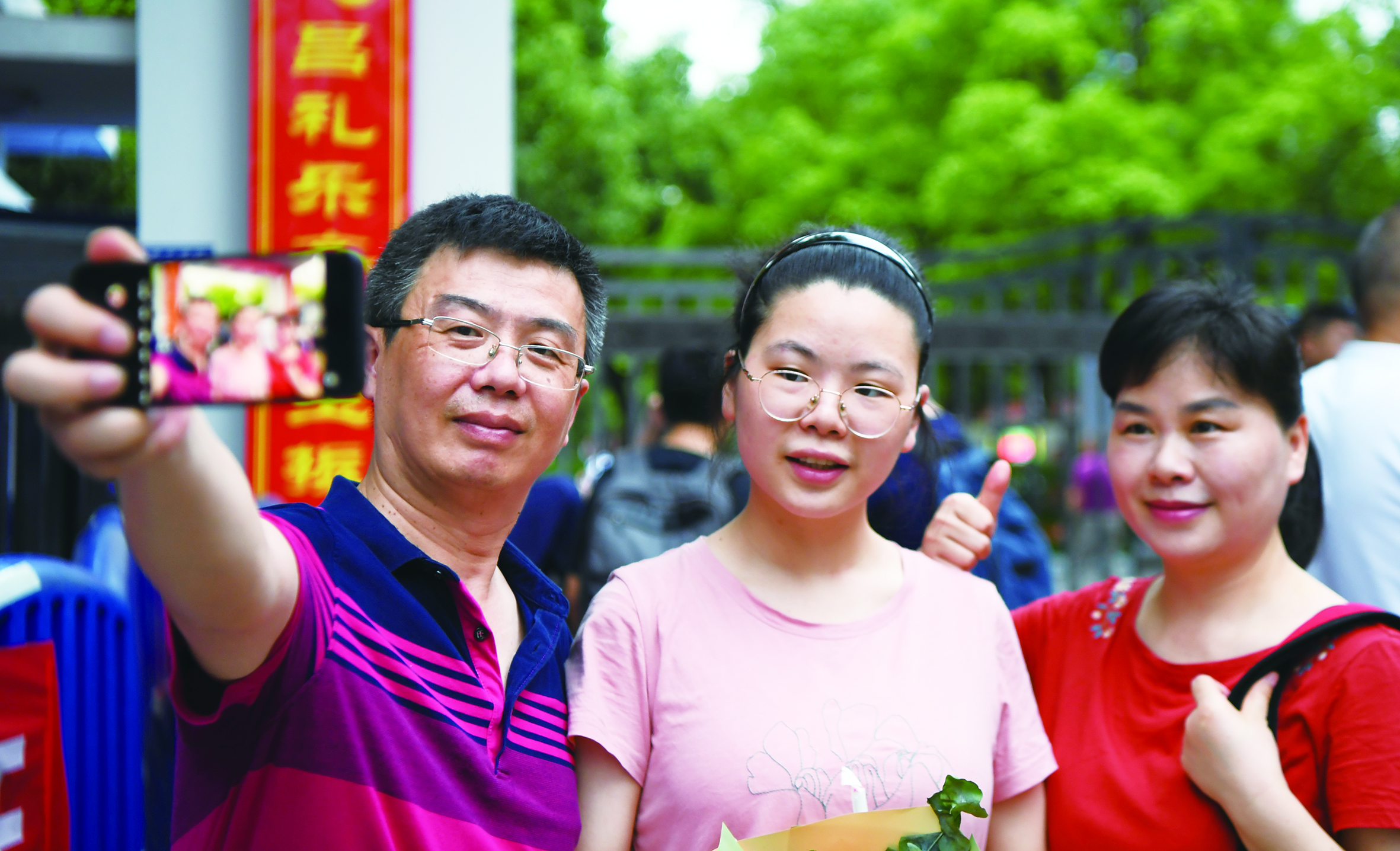 6月9日,在湖南省长沙市一中考点外,考生(中)在考试结束后与父母合影。 新华社记者 薛宇舸 摄