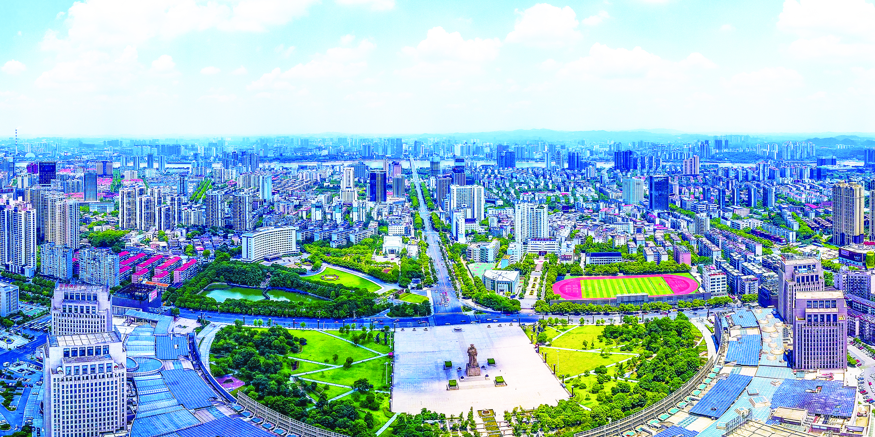 从河东跨过株洲大桥,一条笔直宽广的大道一路向西,抵达天台山下的神农广场,这就是曾被评为“湖南省最美一条街”的天台路。天台路虽然全长只有2.3千米,但它是河西第一条城市主干道,也是河西新城的中轴线,新区的建设发展正是由它开始向两边延展开来。