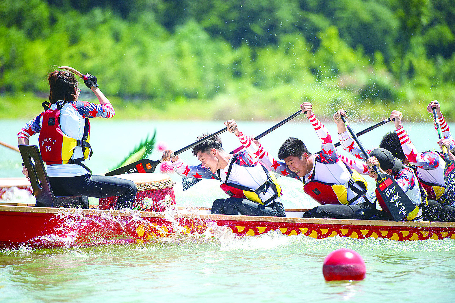6月13日,在湖南省汨罗市屈子文化园举行的龙舟表演赛上,参赛龙舟队员在比赛中奋勇争先。端午节临近,各地举行丰富多彩的民俗文化活动,迎接传统佳节的到来。