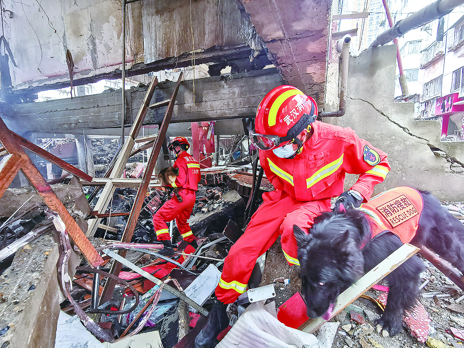 6月13日,消防救援人员和搜救犬在现场搜救。 新华社记者 肖艺九 摄