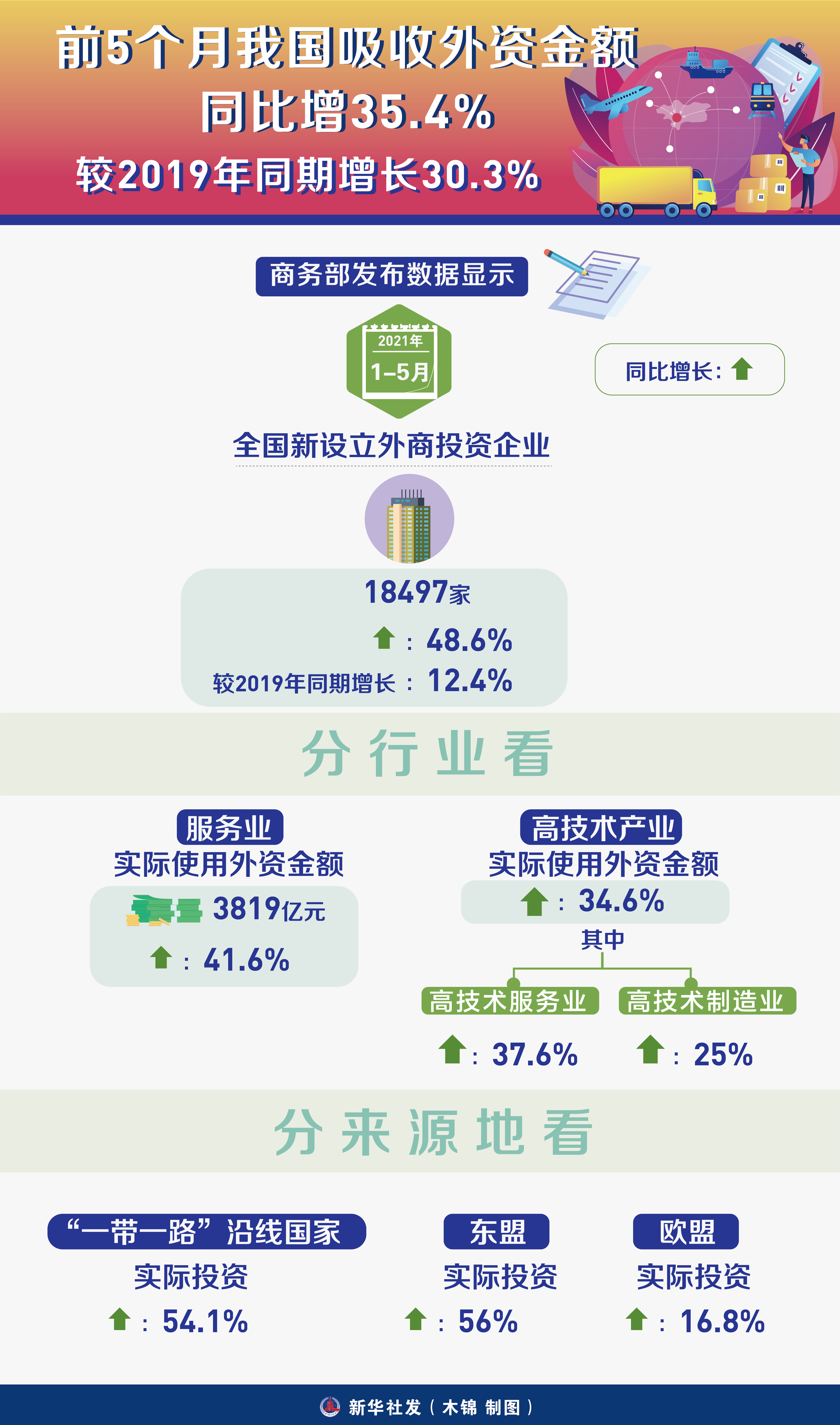 商务部发布数据显示,1至5月,我国实际使用外资金额4810亿元,同比增长35.4%,较2019年同期增长30.3%。