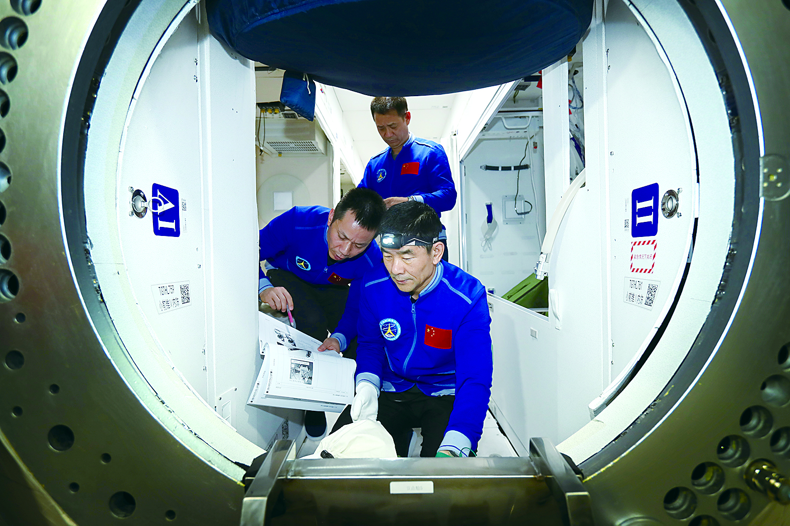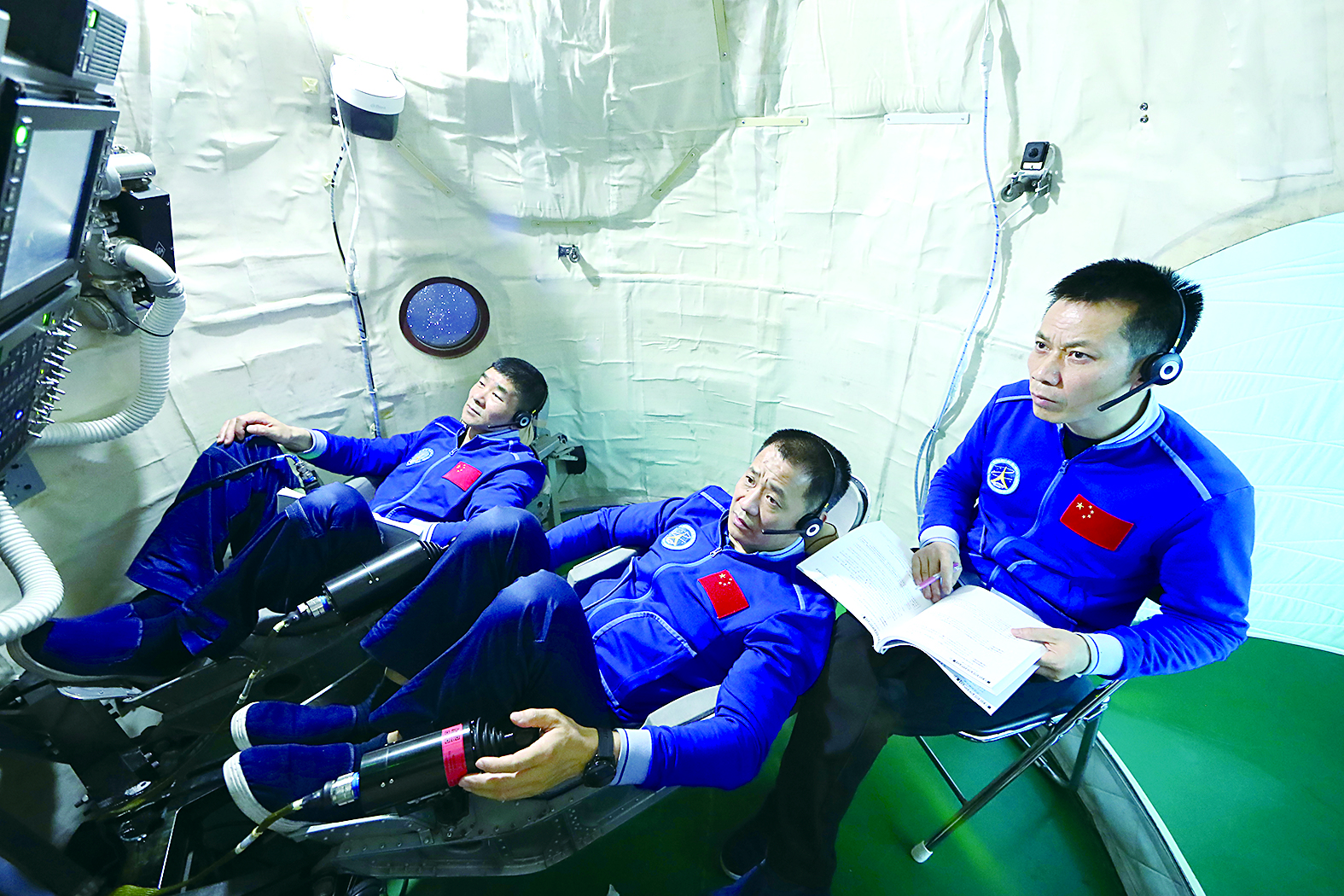 ▲航天员聂海胜、刘伯明和汤洪波在核心舱模拟器内训练(4月22日摄)。