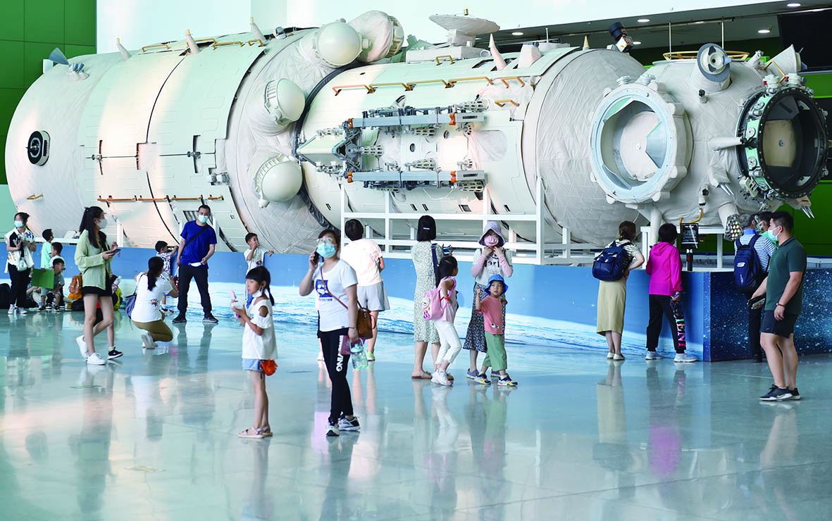 6月19日,不少家长带着孩子来到位于北京市朝阳区的中国科学技术馆,参观“天和核心舱”结构验证件实物,了解中国空间站相关知识。