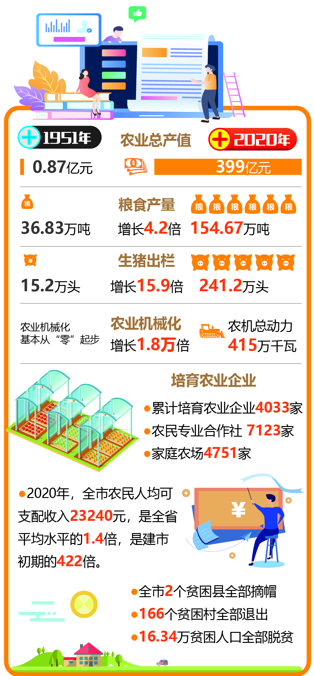 2020年,全市农民人均可支配收入23240元,是全省平均水平的1.4倍,是建市初期的422倍,“十三五”期间农民人均可支配收入年均增长8.2%,城乡居民收入比缩小至2.09:1。
